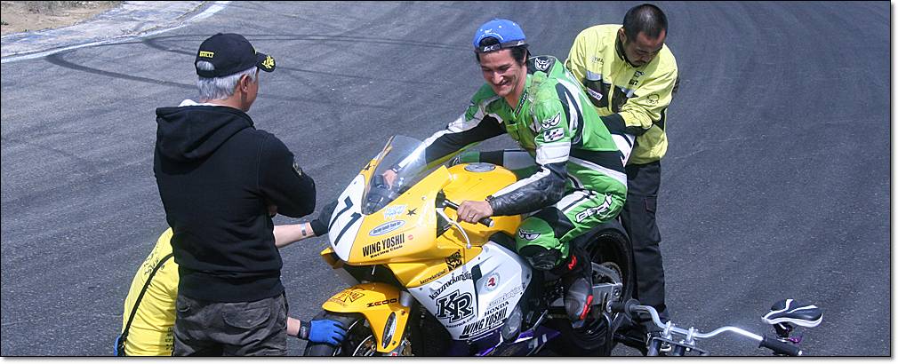 XR100でオーバルをぐるぐる周り、膝スリを実際に体験するのが目的。
