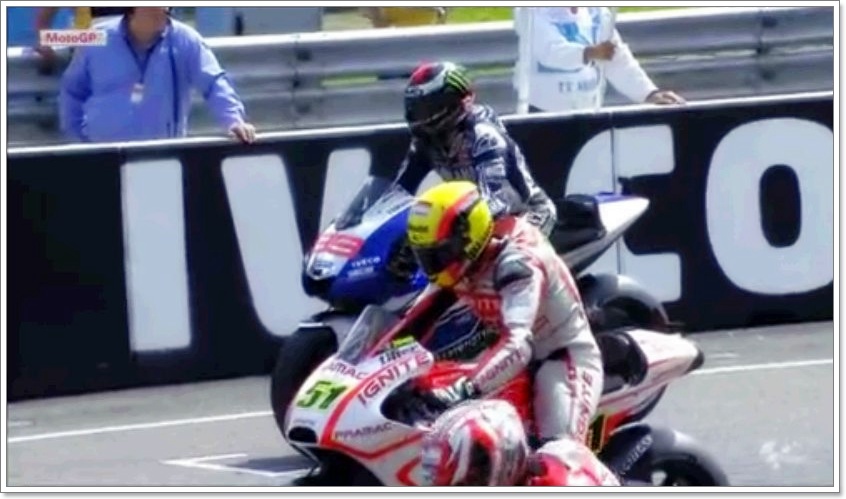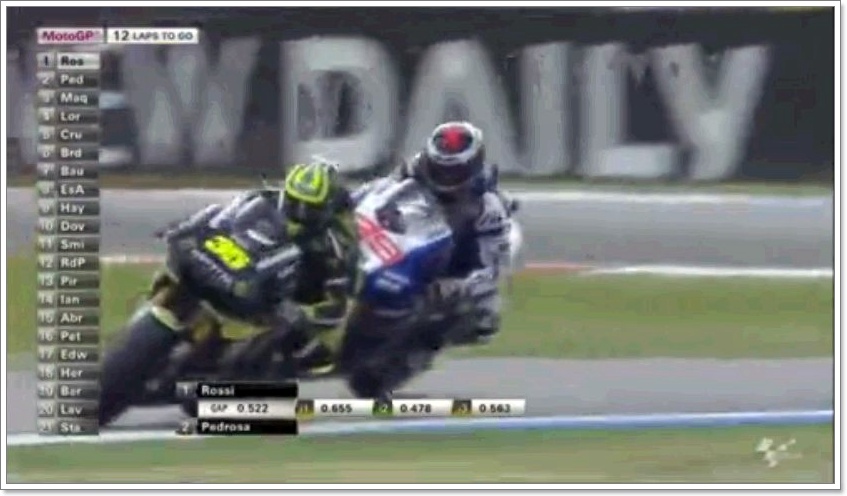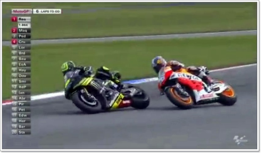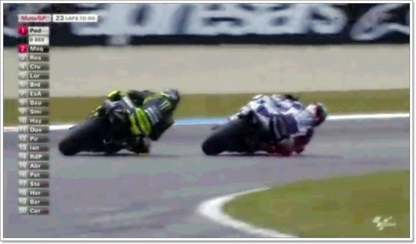 麻酔が切れて痛みがぶり返してきたのか、どことなくラインやブレーキがあやしくなってきたロレンソをクラッチローがパッシング。