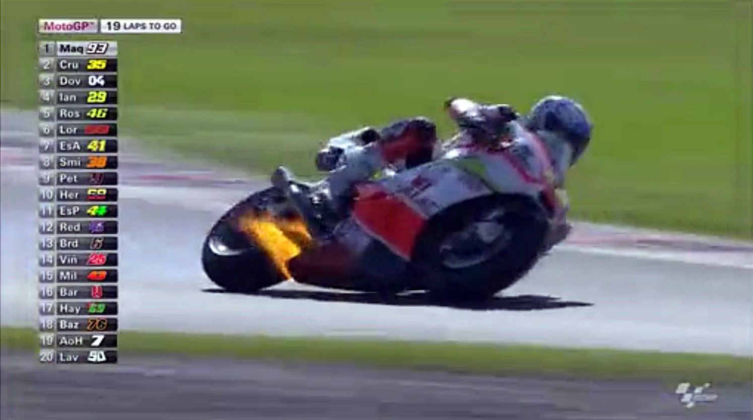 ヨニーヘルナンデスのマシンが燃えちゃったりしてましたね。アツイ走りだね!でもこれアブねぇわ~、ヘルナンデスはこの先のコーナーでコースアウト。幸い大事には至らなかったようですが怖いですね。