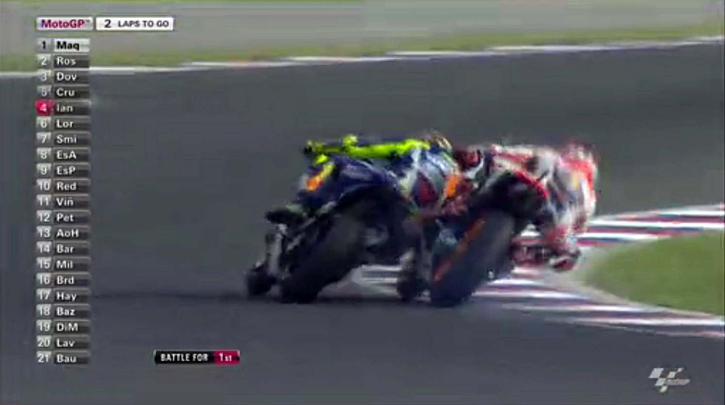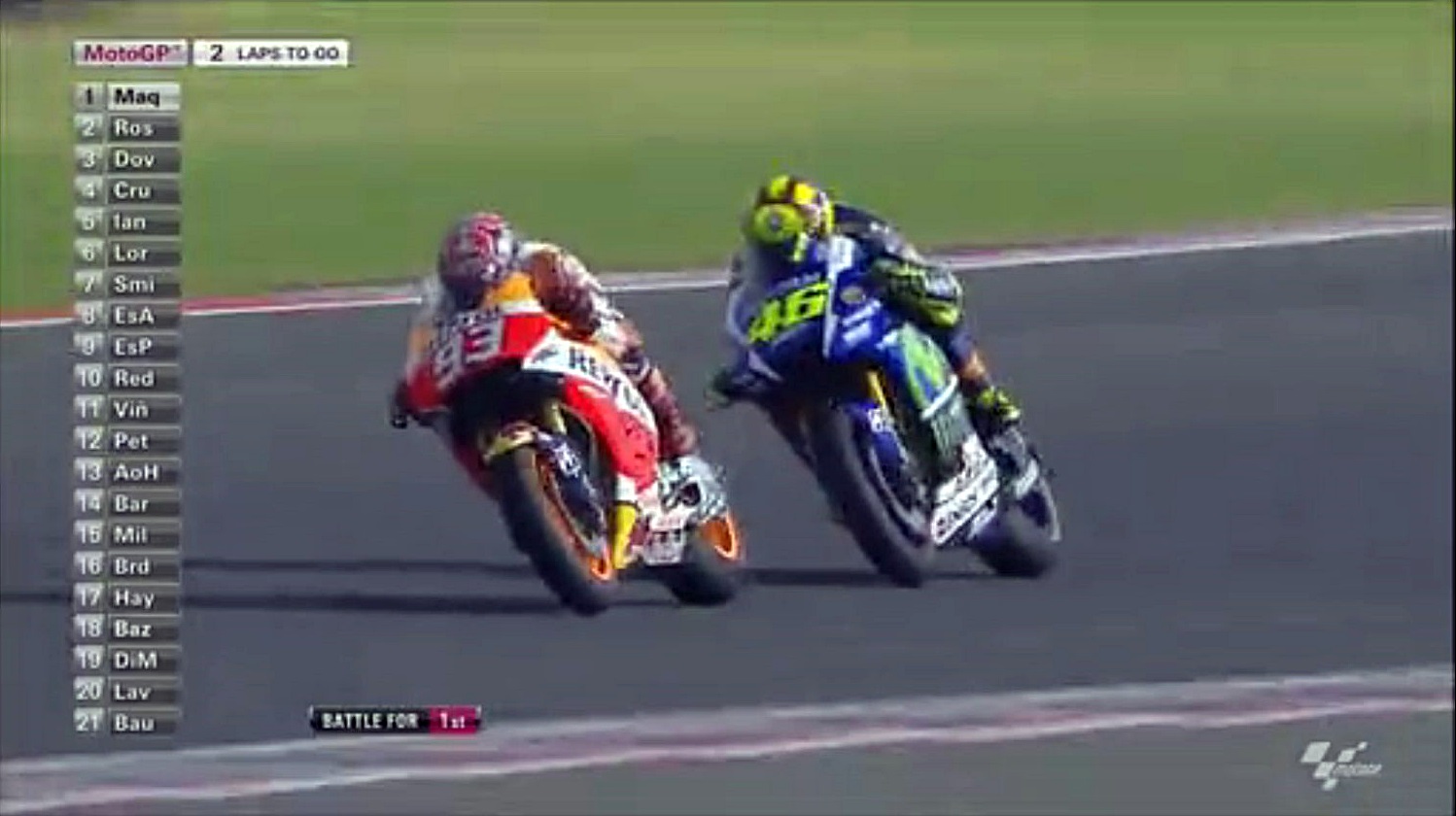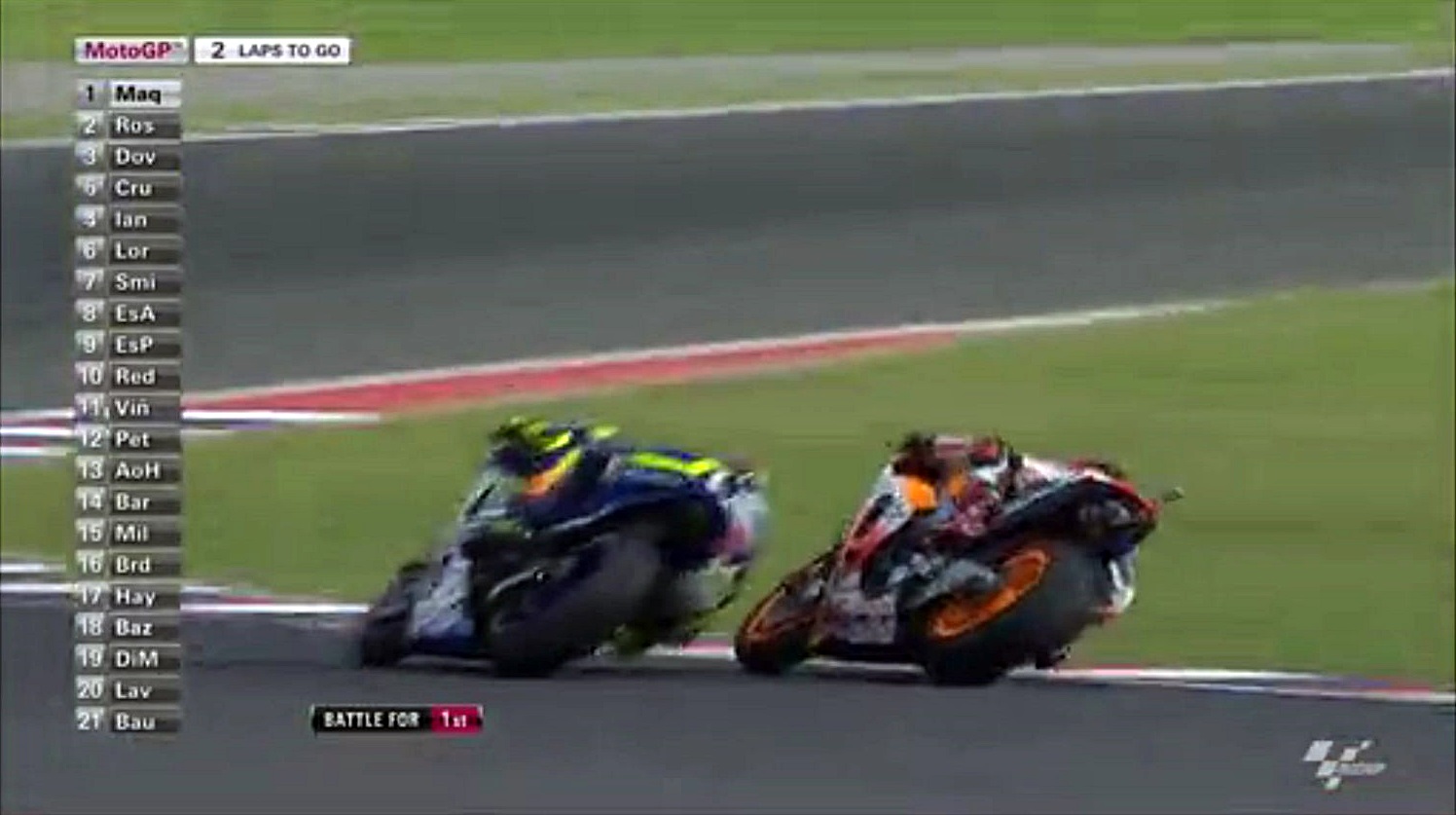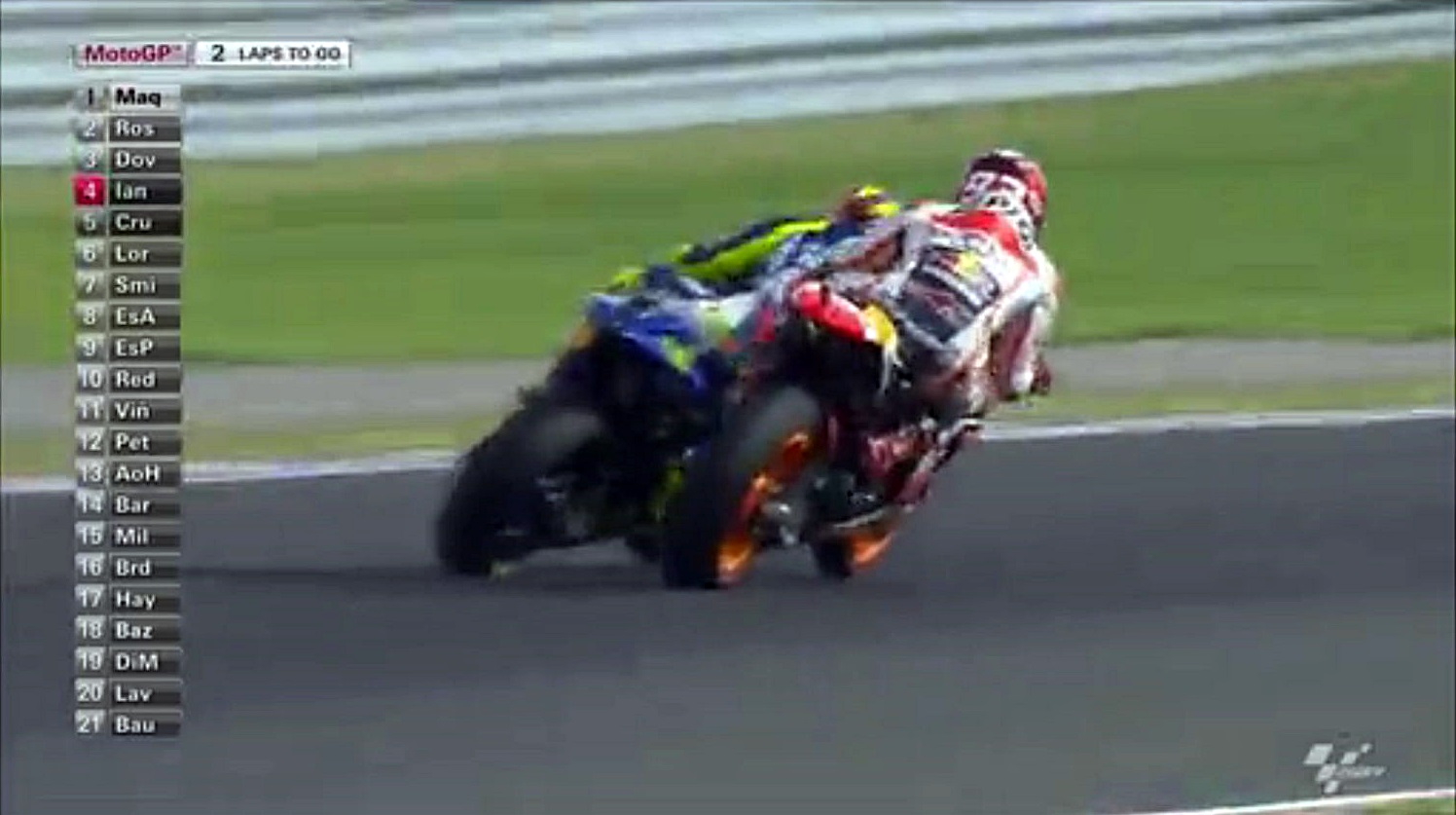 タイヤがヘタってきたマルちゃんが侵入スライドで滑りすぎたスキを逃さずインをつくロッシ