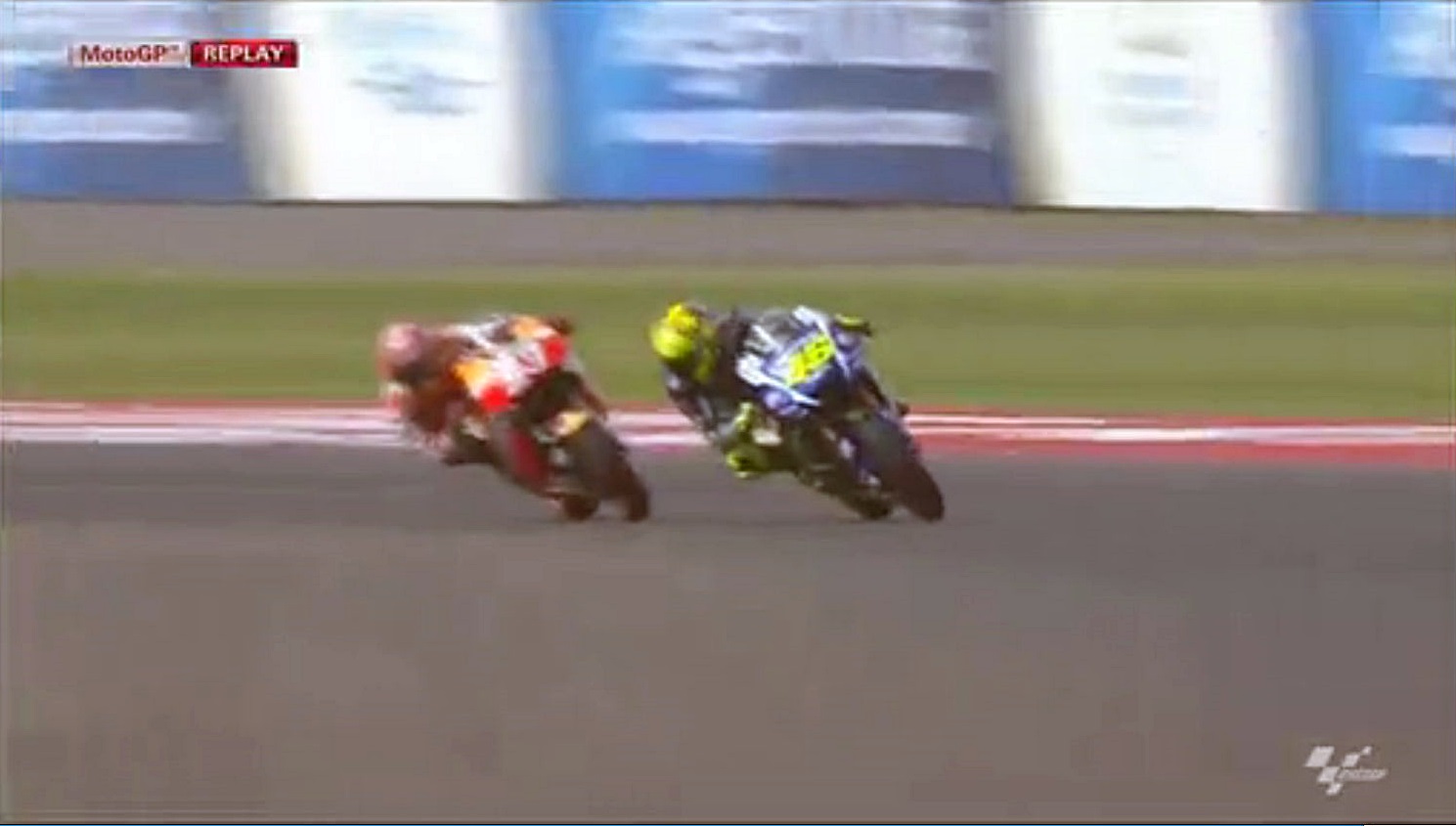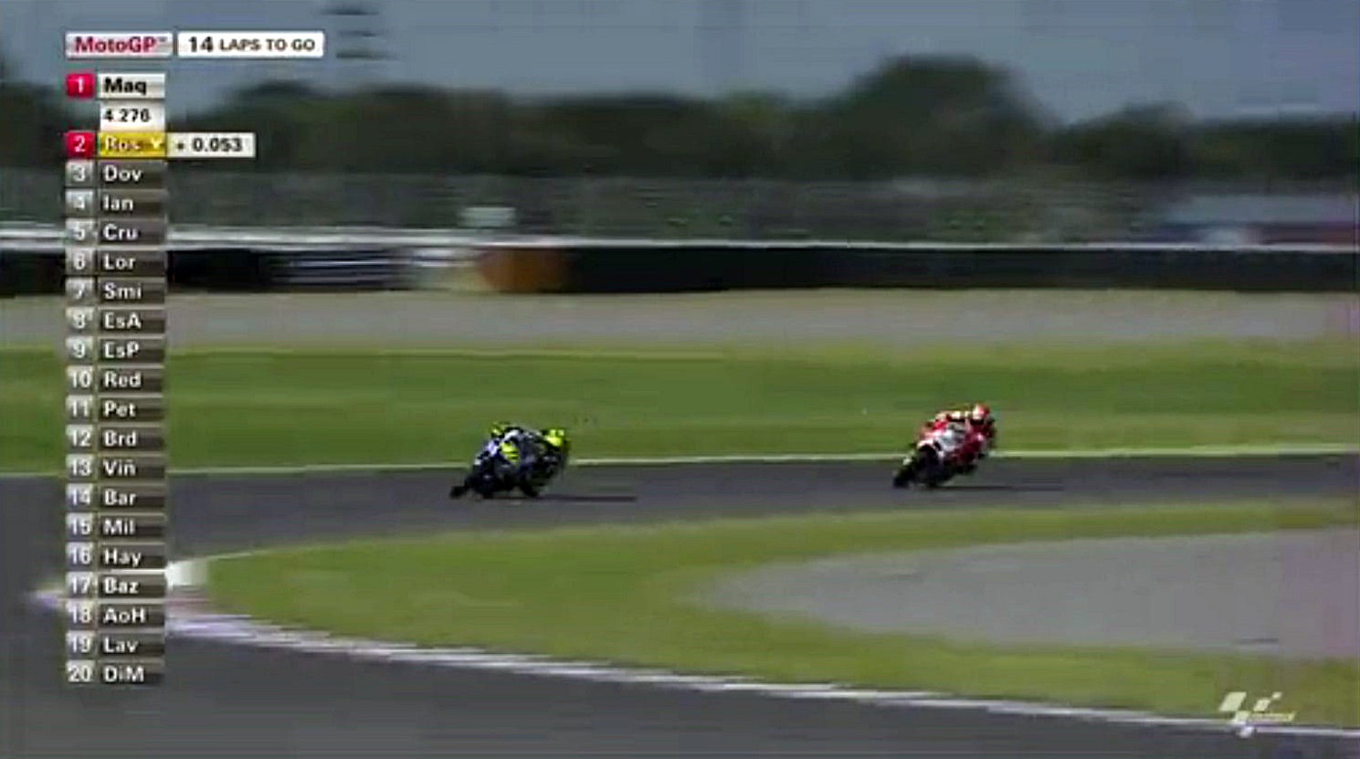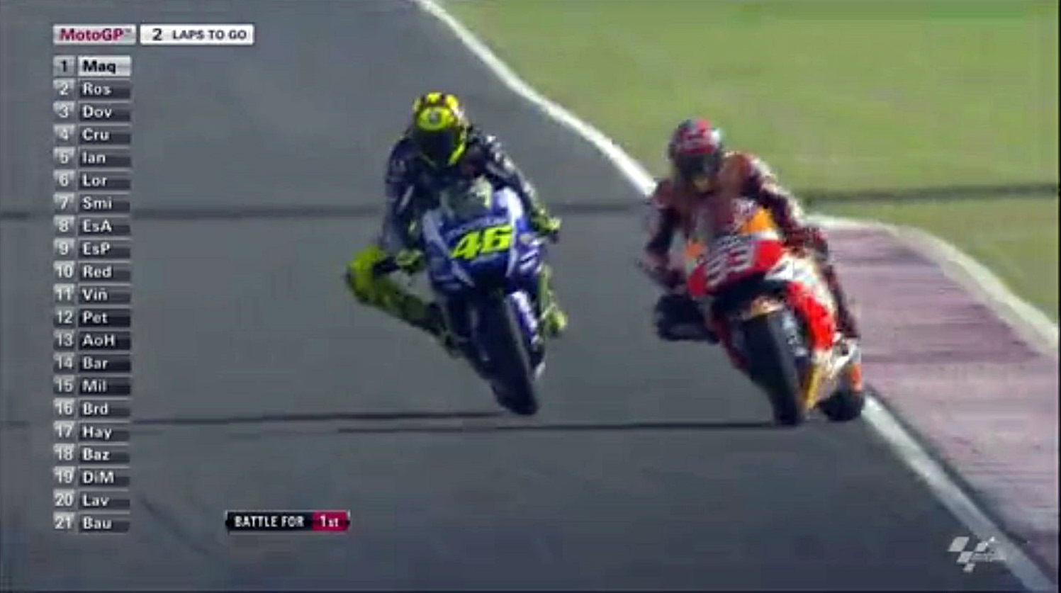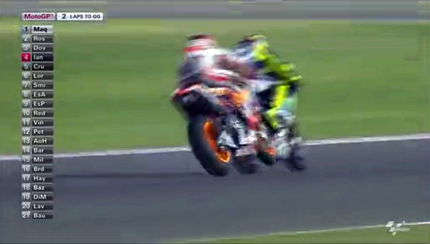 タイヤがヘタってきたマルちゃんが侵入スライドで滑りすぎたスキを逃さずインをつくロッシ