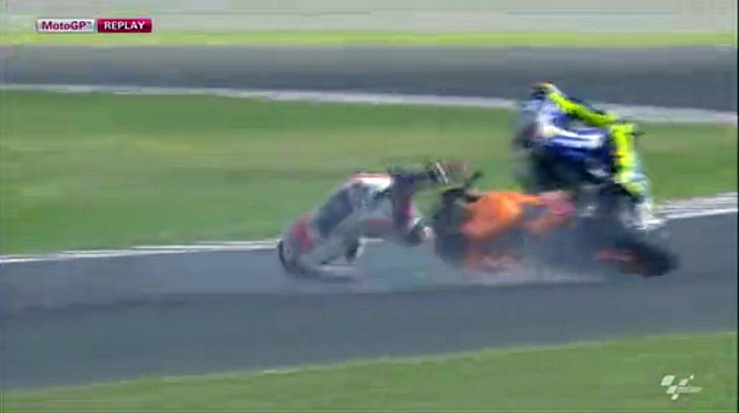 切り返しで接触した時にフロントタイヤが浮いてしまっているので、これはもぅリカバリーできなかったんでしょうね、残念。でもあれはロッシが先なので突っ込んじゃいけないところだよねぇ、やっぱりレース中闘争本能全開で冷静には判断できないのかなぁ。接触+タイヤがヘタってる状態じゃ難しかったのか。