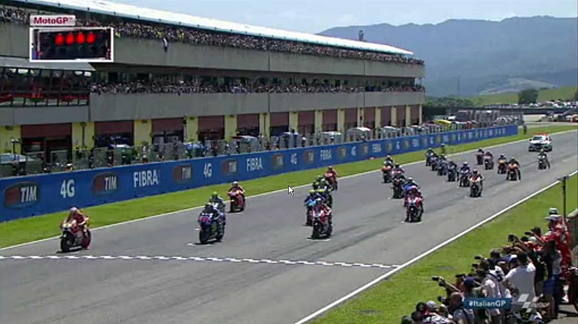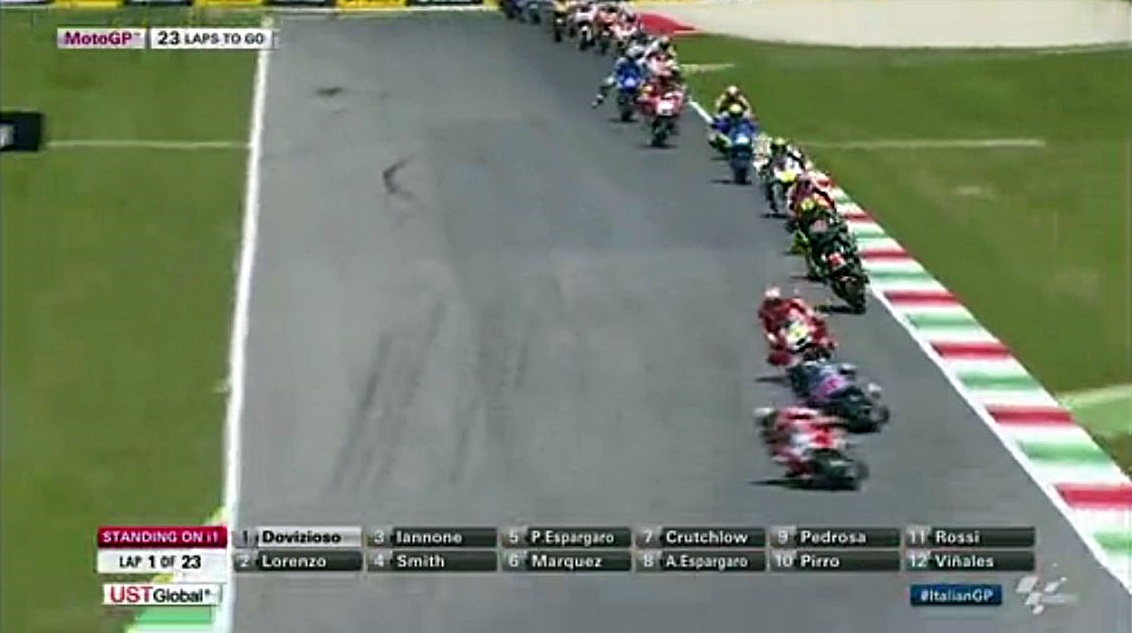 ポールポジションのイアンノーネが疑惑のスタート。これちょっとフライングでない?でない?とりあえず流されちゃったけどさぁ、イタリア開催だからペナルティとらないんじゃね?って邪推されちゃっても仕方ないよねぇ。ちなみにアブラハムはアウト。ドンマイアッブ;