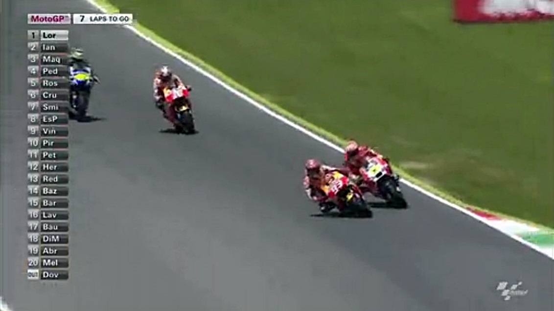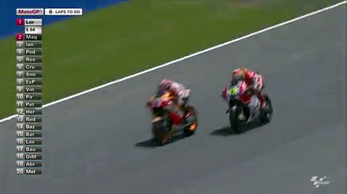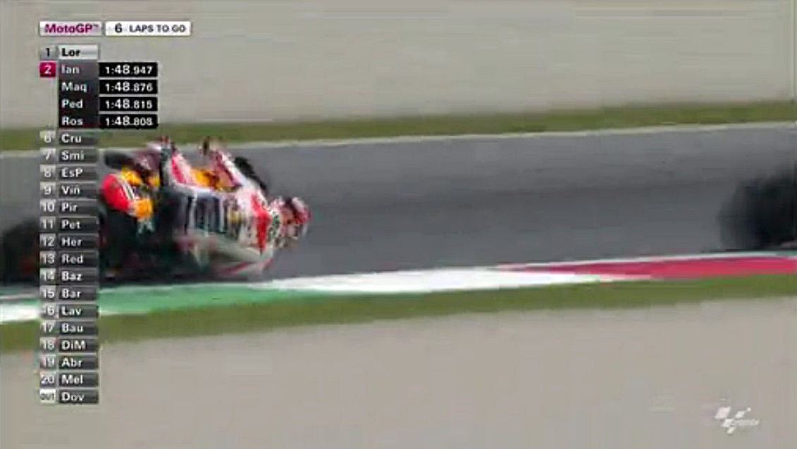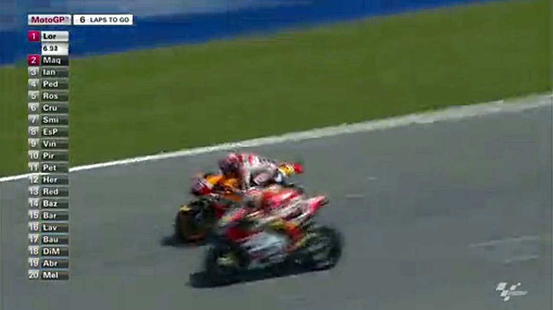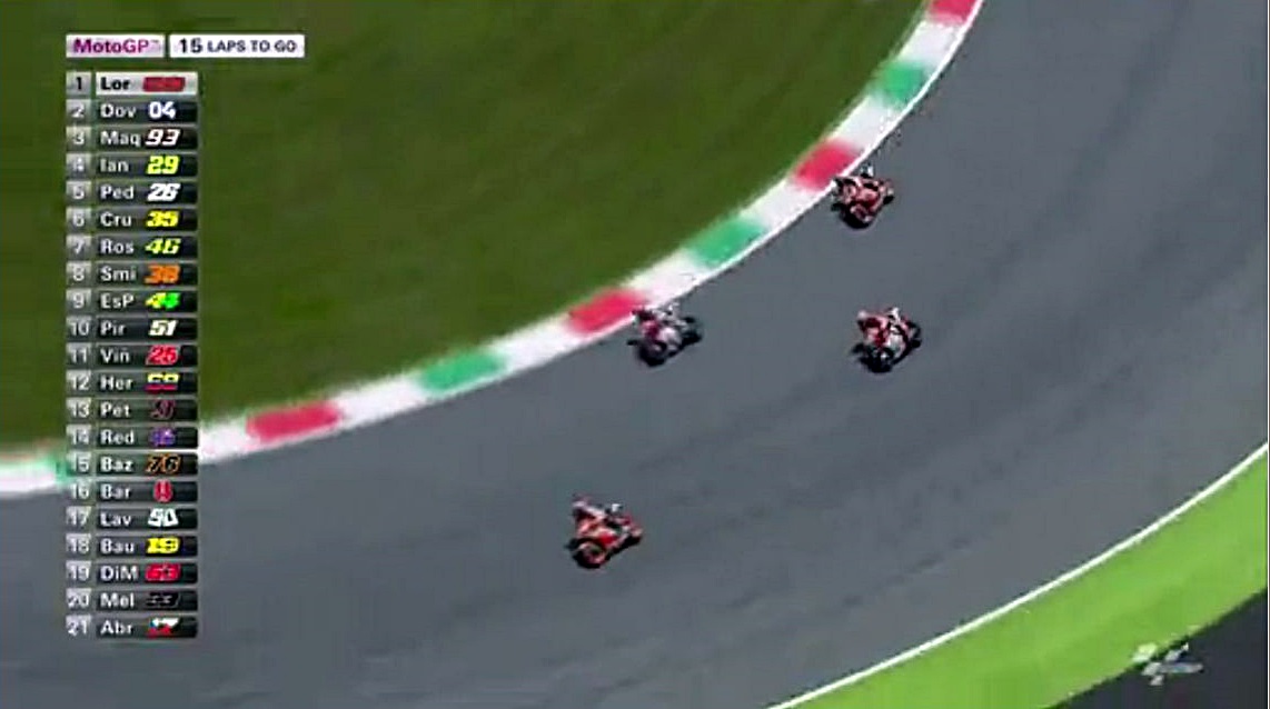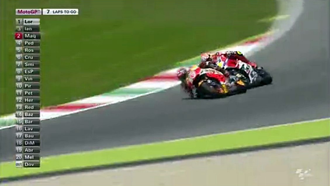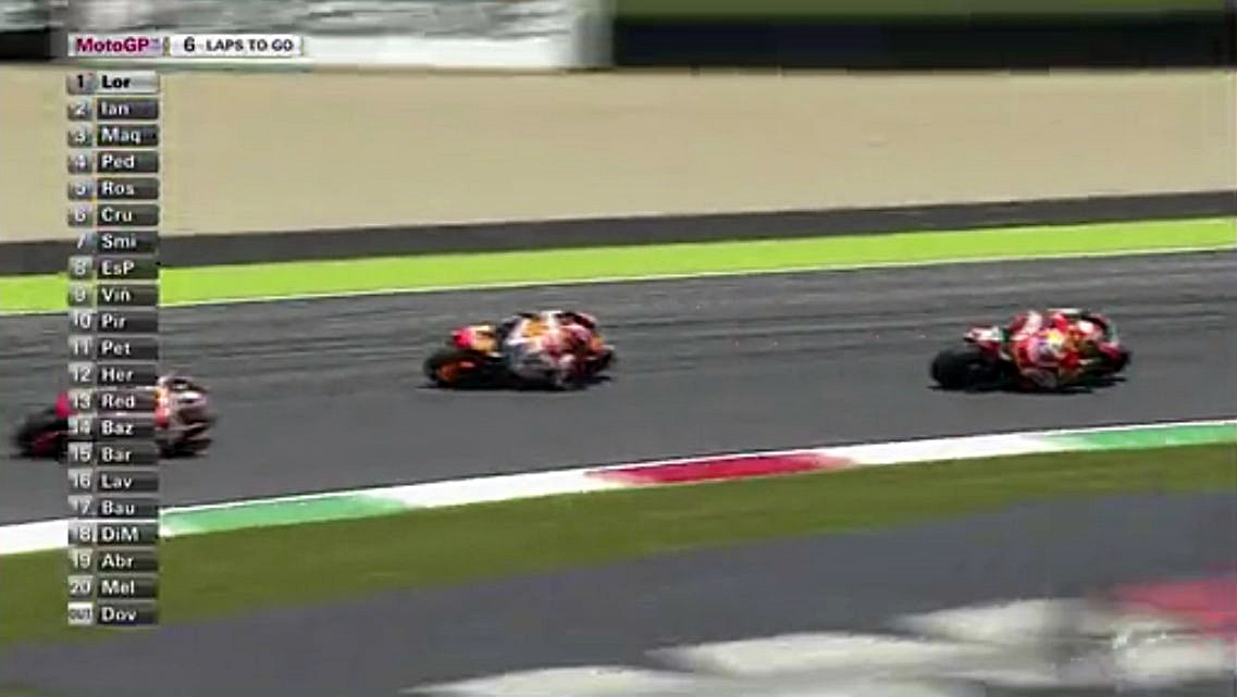 そんなロレンソの一人旅が始まる中、中盤まではドカとホンダの2位~4位争いが続きます。序盤はアグレッシブだったマルちゃんも、時々突っ込んでオーバーランしながらも悔いてますが