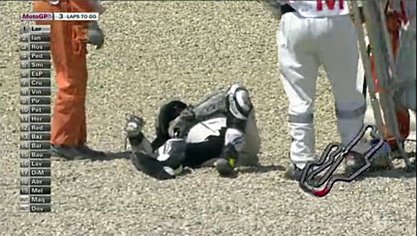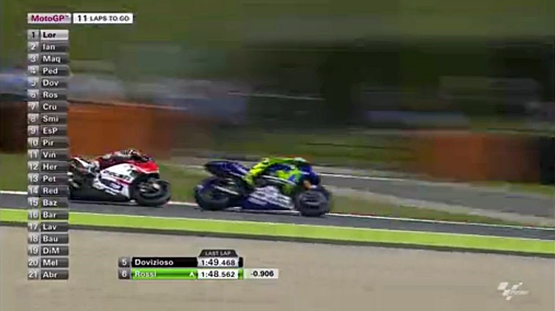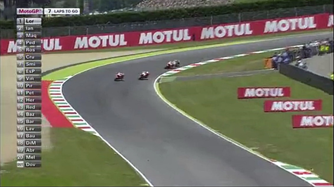 そしてあっさりとドヴィを抜くロッシ先生。中盤のこのスピードはおかしいわ、なんで予選でそれが出ないんだろう?まぁレースを見る分には面白いからいいんだけどねぇ。でもこのままじゃロレンソを抑えきれなくなりそう。