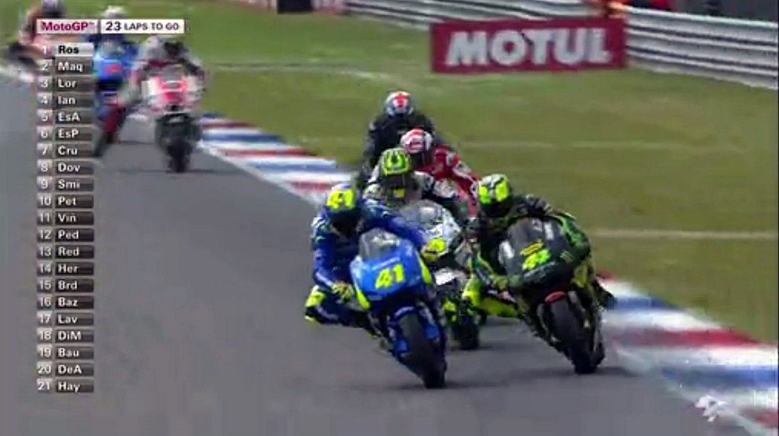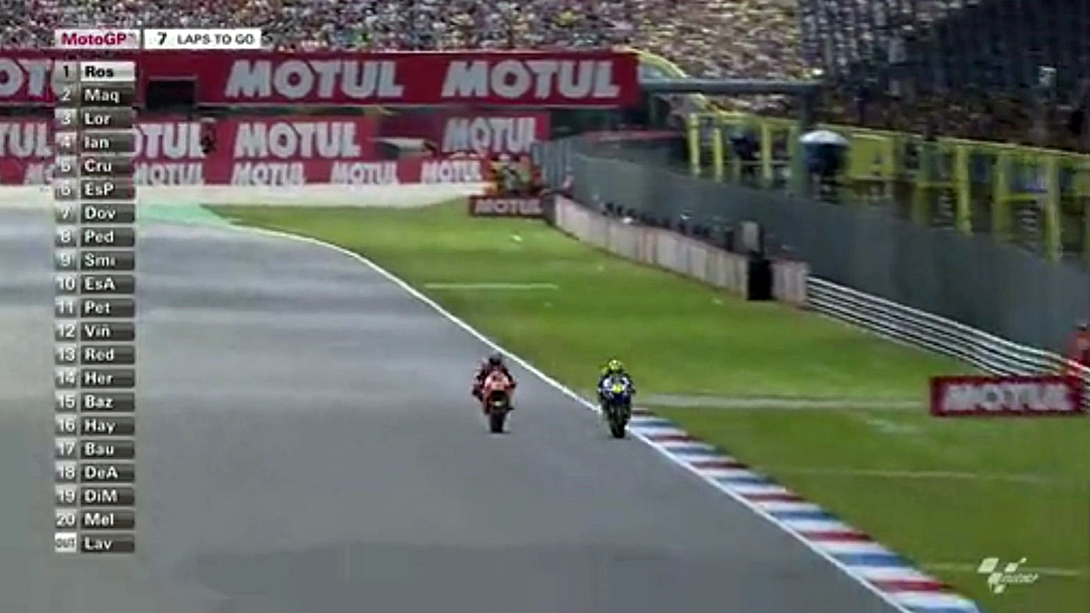 中盤ずっと真後ろに張り付いていつ抜くかとドキドキしてましたが、持ち味を生かしたナイスなパッシングでしたね。ロッシもほぼ完璧な走りでマルちゃんを抑えていたのですが