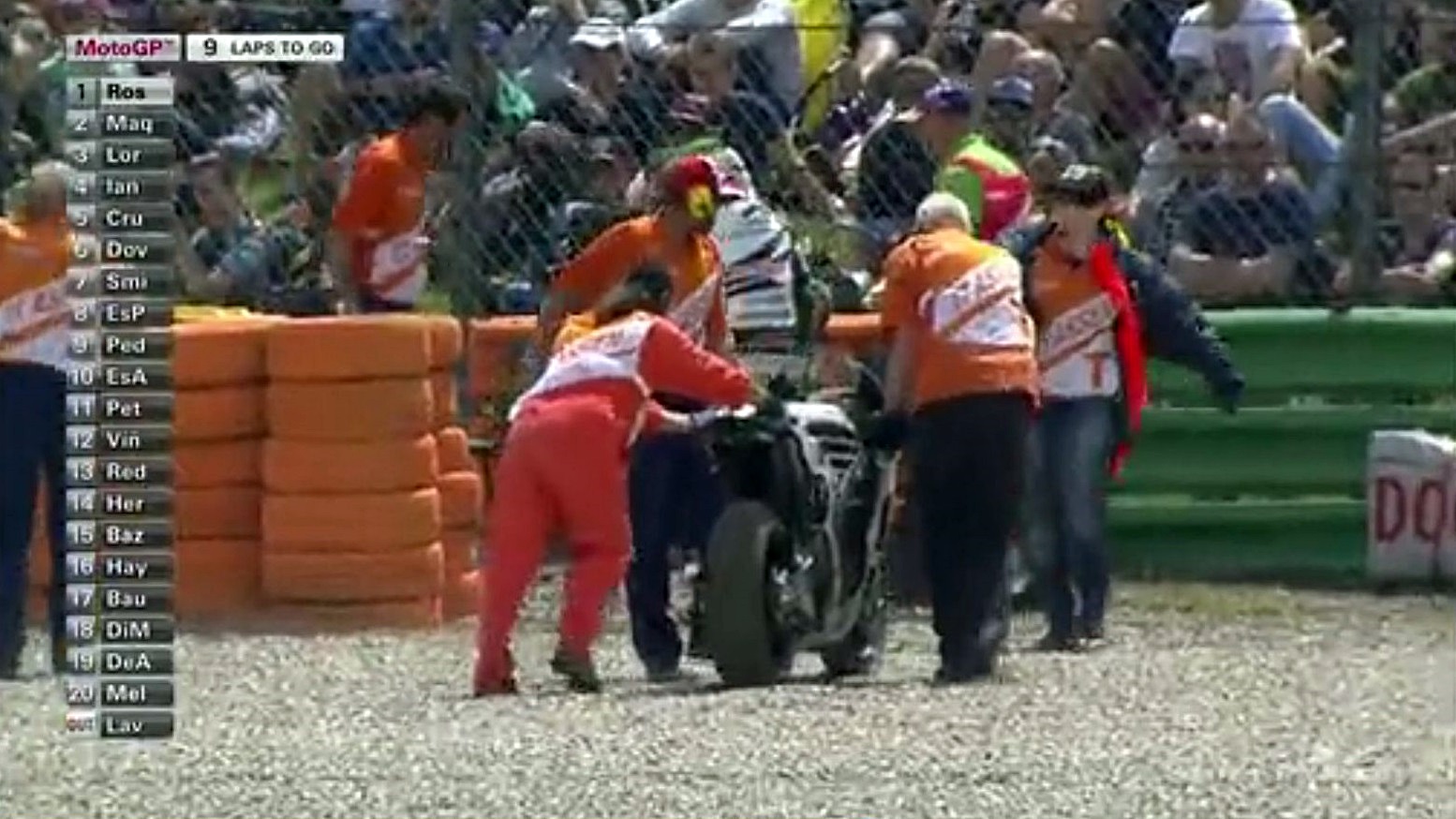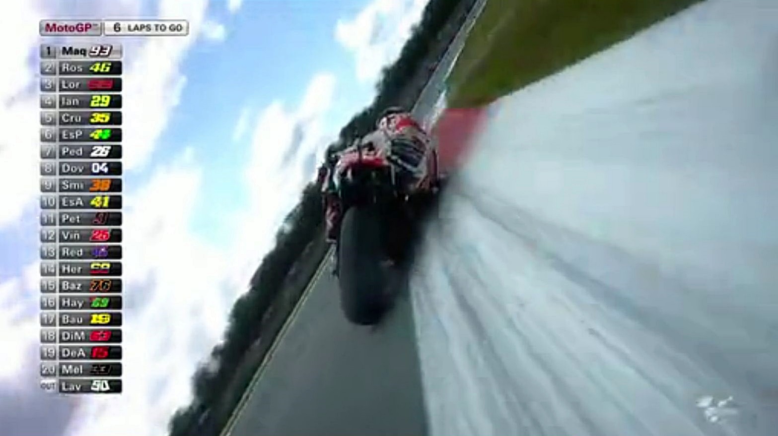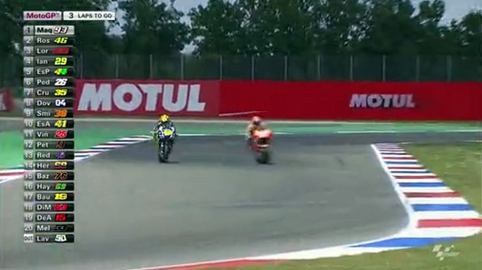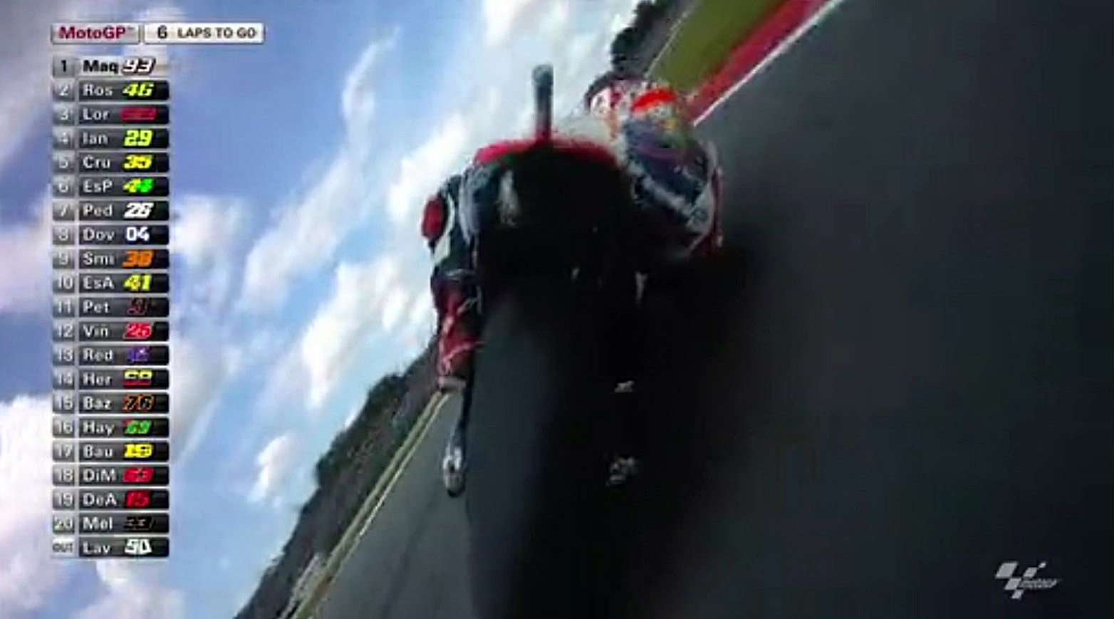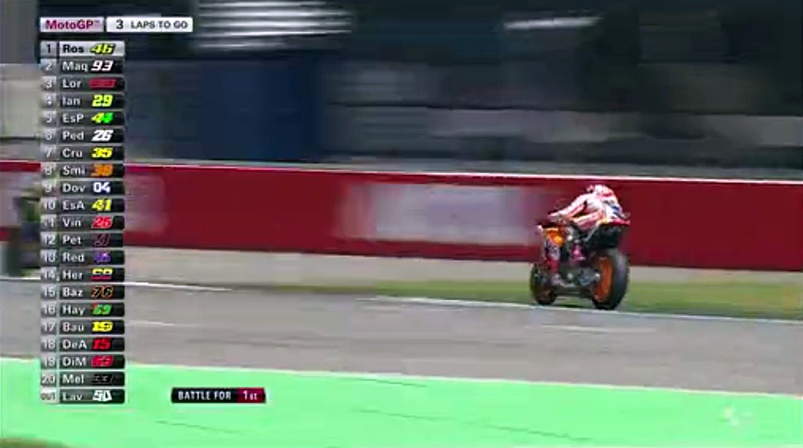 さすがに動揺したのかマルちゃんもちょっとコースアウト。これですこしロッシと距離が空いてしまいました。レースになるとほんのちょっとのミスで差がついてしまいますね。厳しいですがこのシビアさがレースの醍醐味。