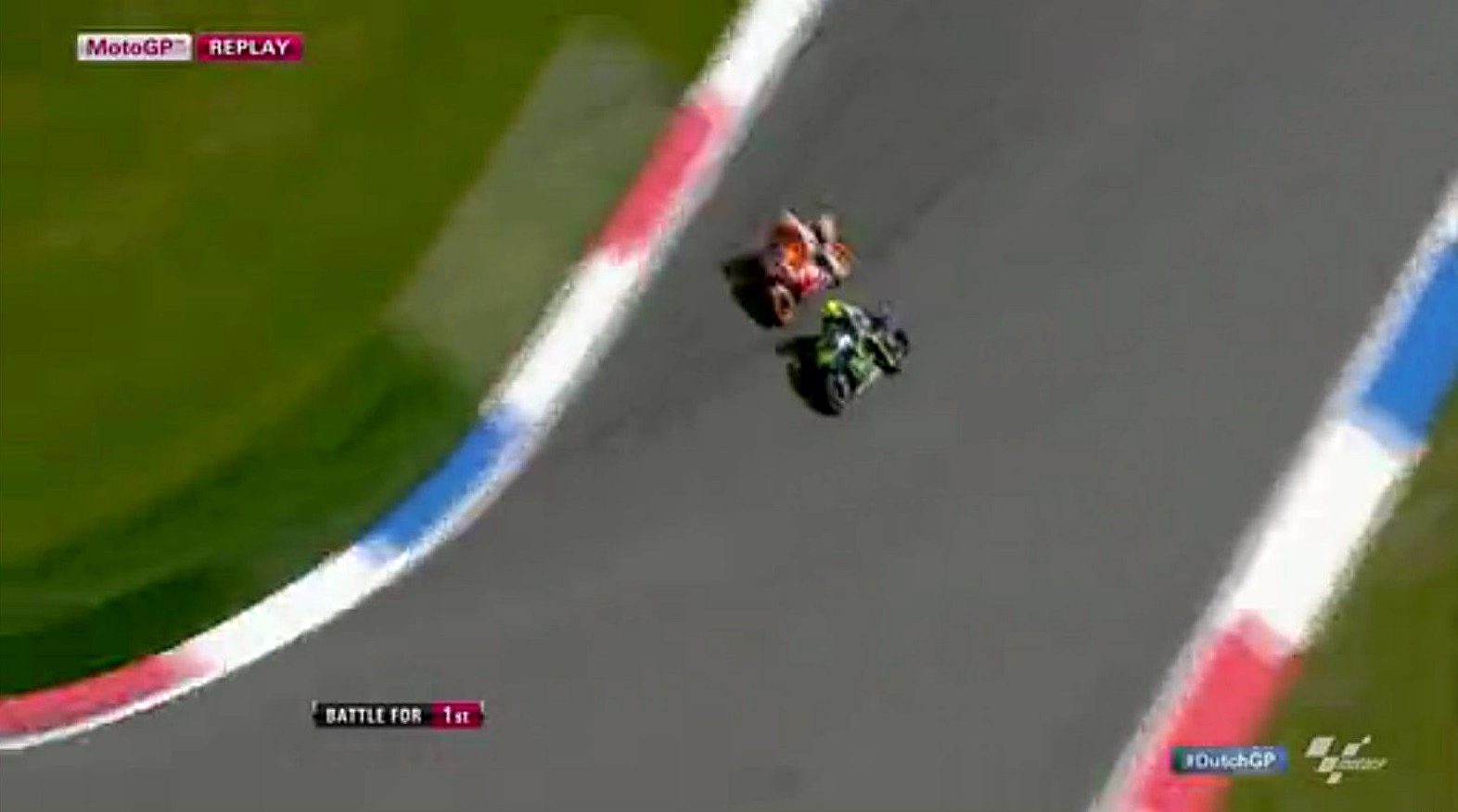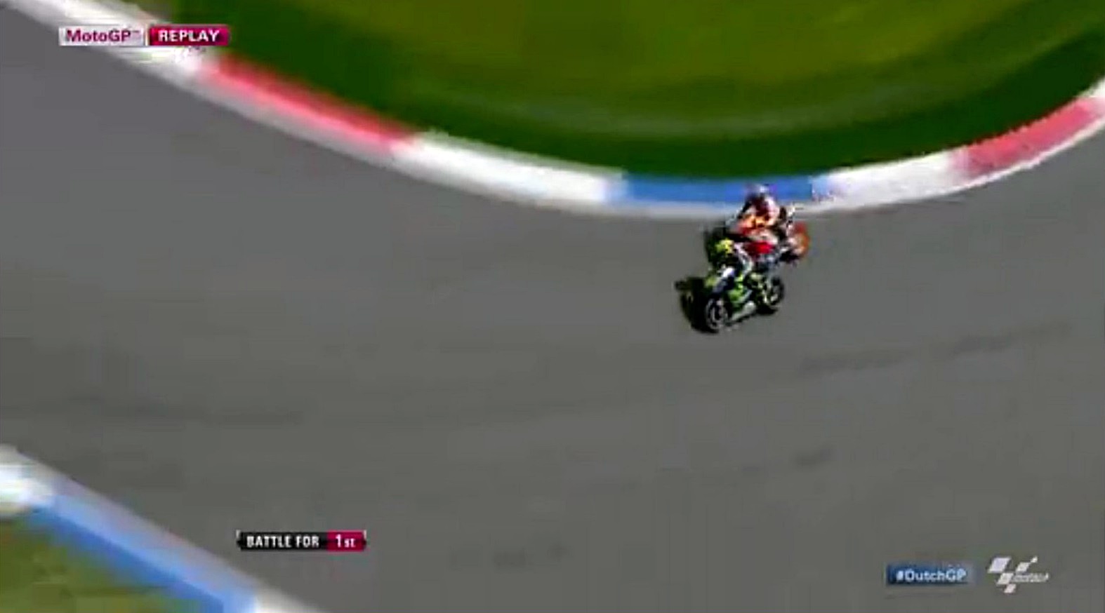 この最終コーナーの勝負はいろいろと物議を醸しましたね。やれマルケスの走り方が危険だ、とかロッシが誘ったんだとか。どちらがコーナーに先に入っているのかはカメラアングルですごく変るように見えるのですが、上空から見下ろす写真が一番わかりやすいと思うのです。