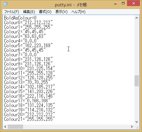 http://aikawarazu.iku4.com/%E3%83%95%E3%83%AA%E3%83%BC%E3%82%BD%E3%83%95%E3%83%88/putty%E3%81%AE%E6%96%87%E5%AD%97%E8%89%B2%E5%A4%89%E6%9B%B4%E3%81%AFini%E3%82%92%E7%B7%A8%E9%9B%86%E3%81%99%E3%82%8B%E3%81%A8%E6%A5%BD%E3%81%A0%E3%81%A3%E3%81%9FPuttyの文字色変更はiniを編集すると楽だった