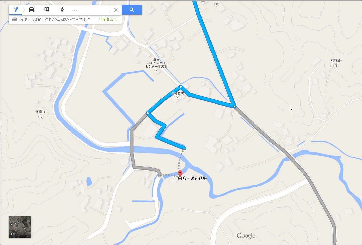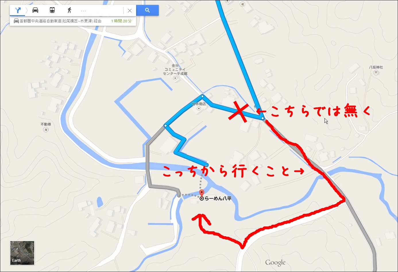 これはgoogleマップのナビ。たぶん他のナビをつかってもラーメン八平への道はこう表示されると思います。