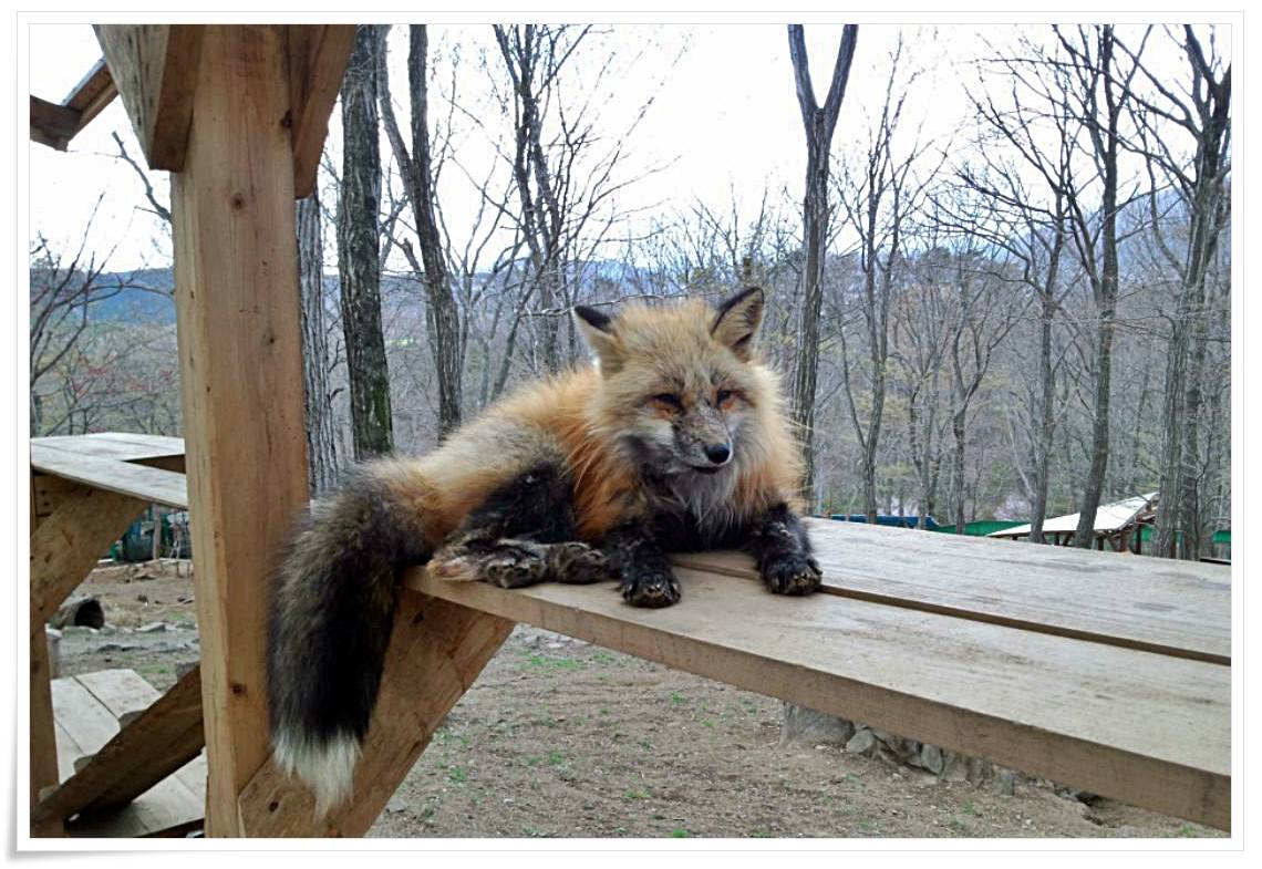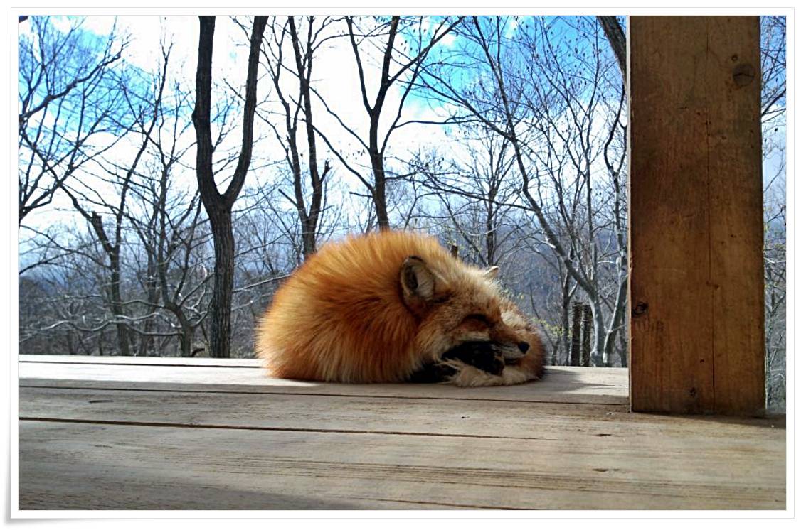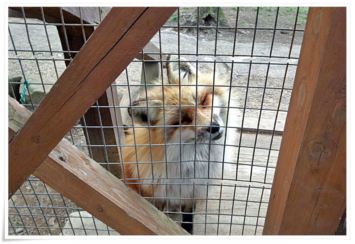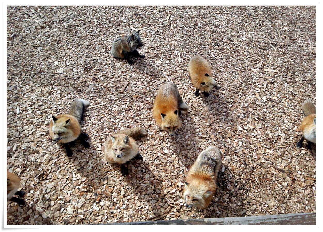 やだ…もぅ…'`ァ,、ァ(*´Д`*)'`ァ,、ァ放し飼いしているエリアは、山の斜面をつかった一周30分ぐらいの広さなんですが、ほんとそこら中にキツネさんがいました。