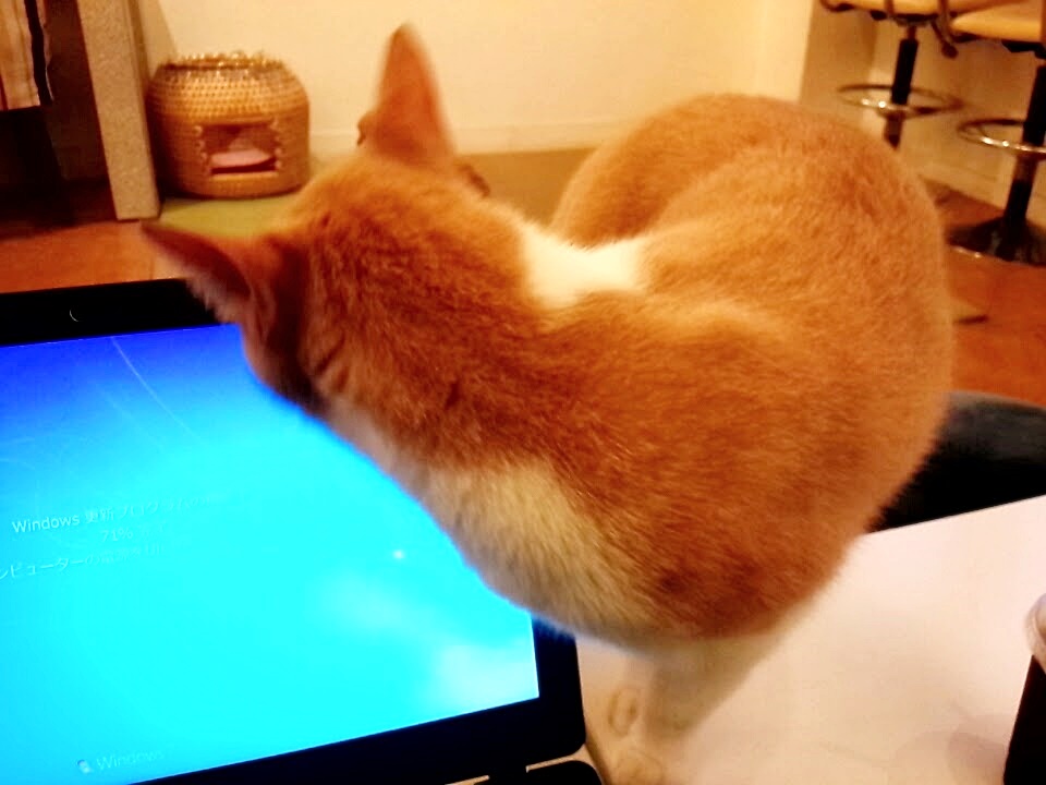 背後の棚からじーっとこっちを見つめるニャンコ。振り返ると視線外すんだけど、元に戻るとまた気配がががっ!まったくこいつは油断ならねぇぜ・・・