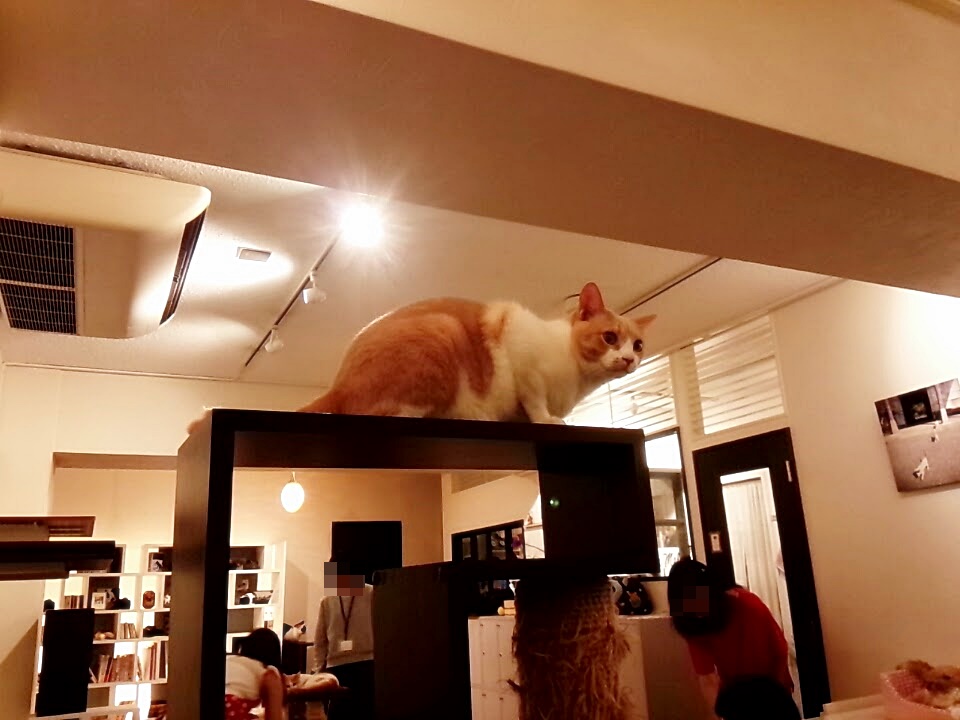 そんなに店内は広くないのに23匹もにゃんこがいるので、ソファーやテーブルがにゃんこだらけ!拙者ネコカフェ素人なのでちょっと落ち着けるところへ・・・あ、窓側のハイチェアーの席ならちょうどいいかな