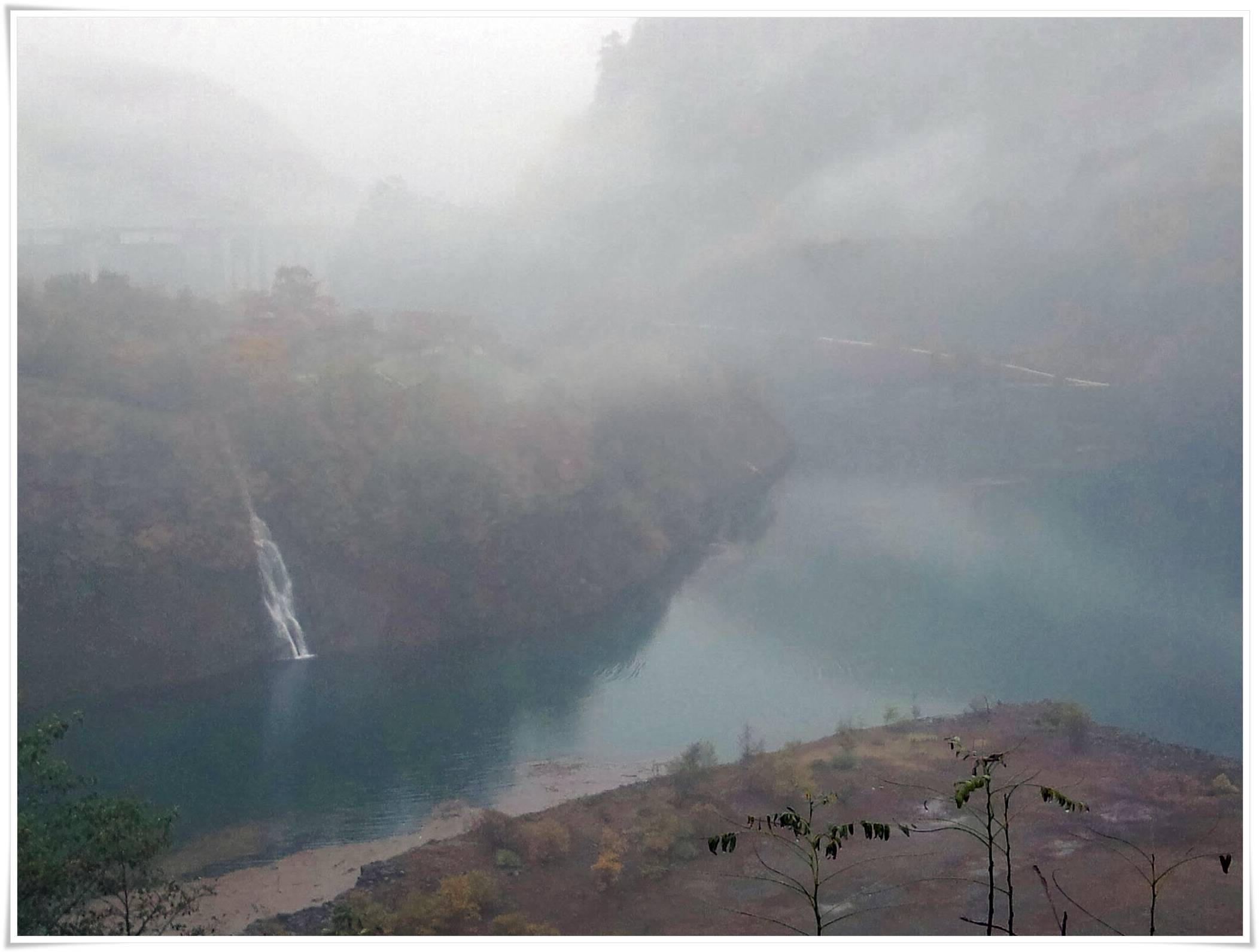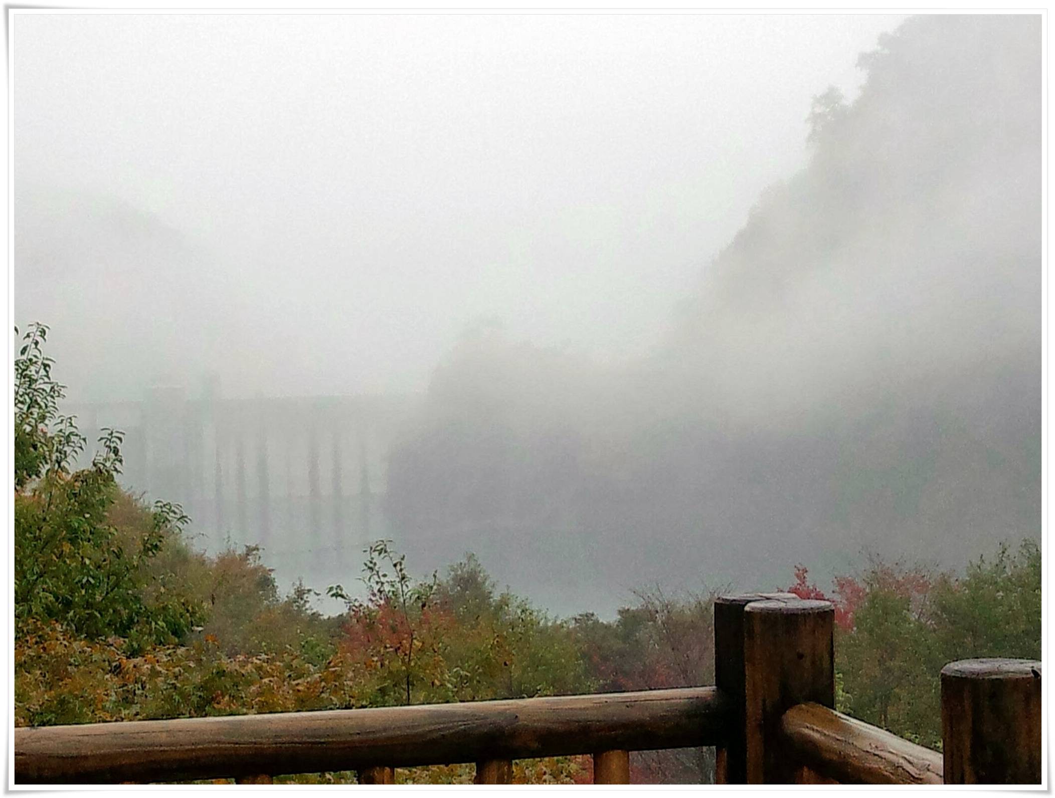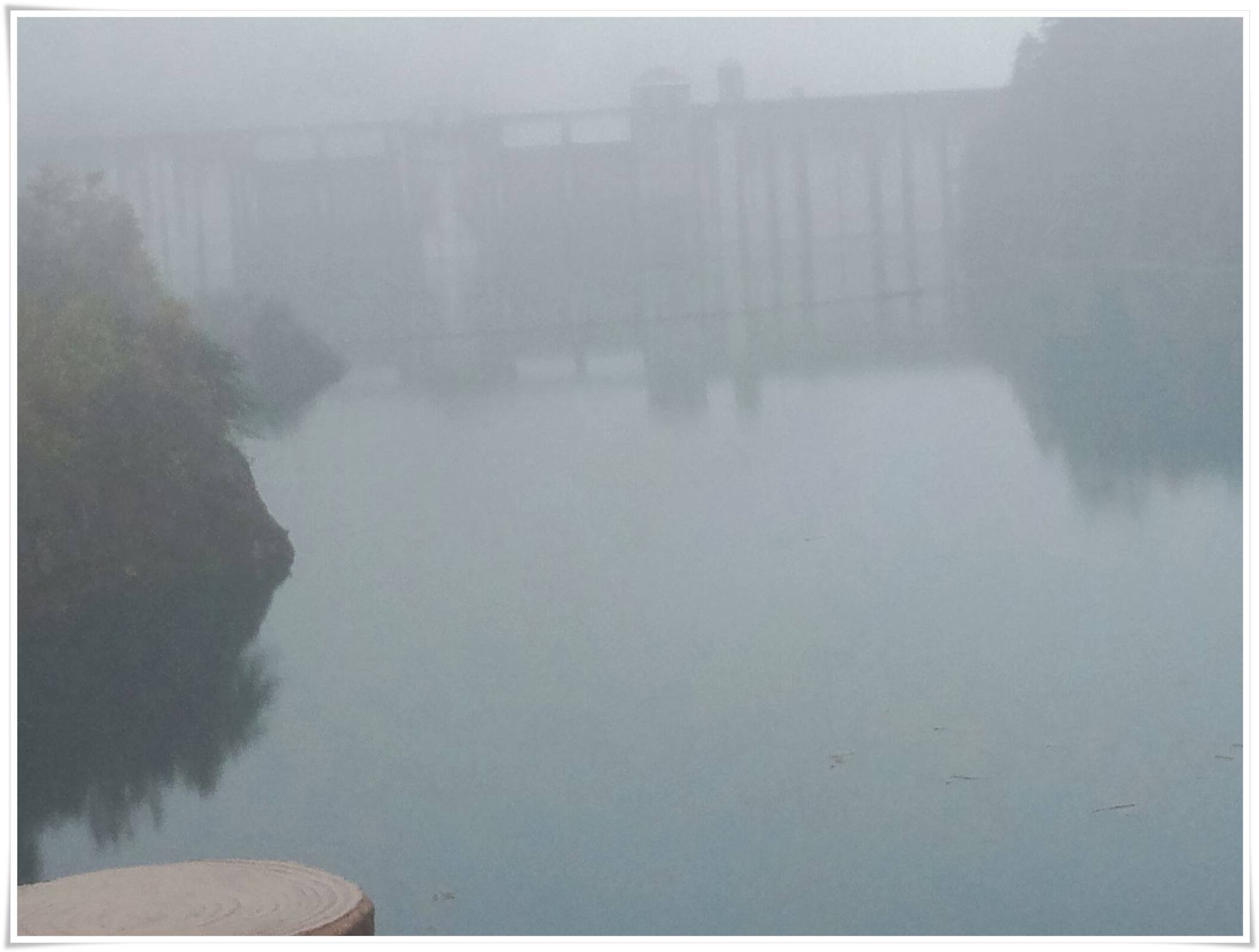 湖から眺めるダムはとっても大きく、霧の深さも相まってすごく神秘的な感じです。