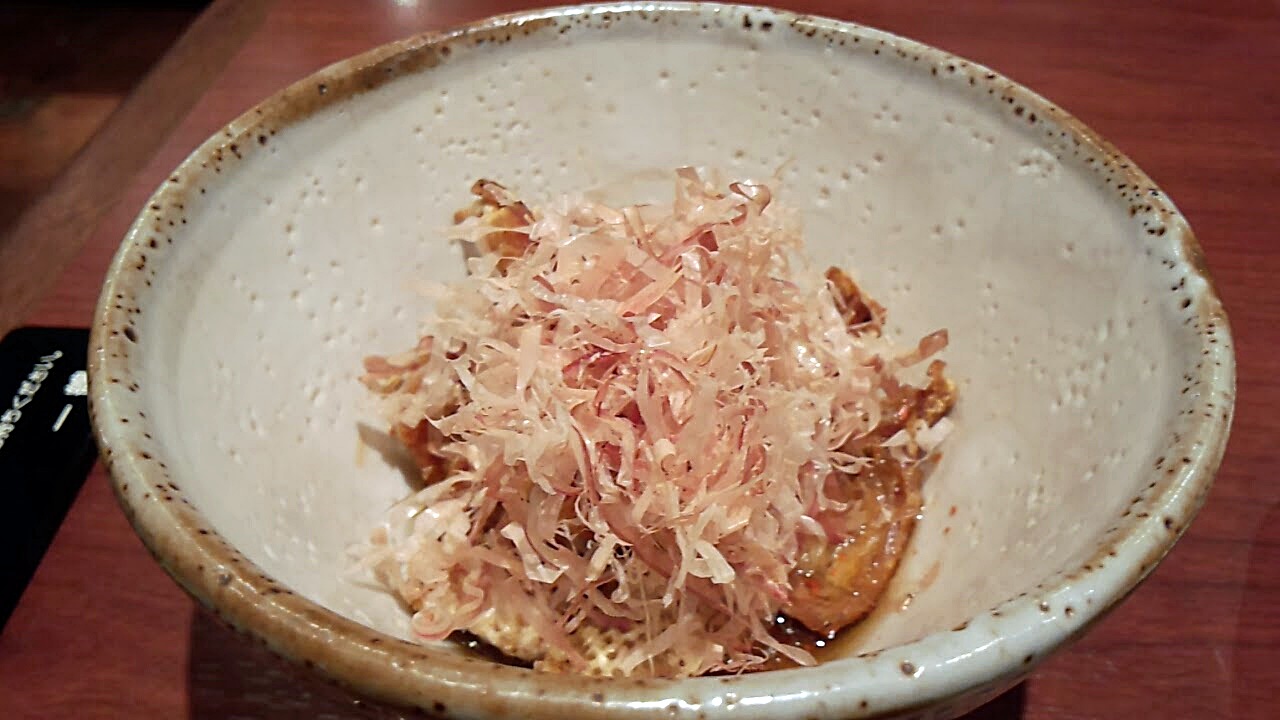 骨付き鳥の油をおにぎりに付けて食べるがうまい!って聞いていたので試したんですが、注文したおにぎりが冷たかったんです。「冷めてる」じゃないんですよ、「冷たい」んです。まるで事前に握って冷蔵庫に入れてあったような冷たさ。握るのは時間かかるから作り置きして冷蔵庫に入れて、注文が来たら海苔巻いてるのかな。