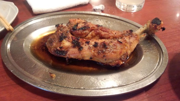 確かに骨付きのもも肉が1本どーんっと出てきました。お皿には鳥の旨味たっぷりな肉汁と脂も一緒です。通はこの脂でご飯(おにぎり)を食べるんだとか。