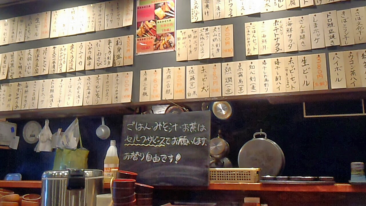 店内の壁にはズラーっとメニューが並んでいます。夜は居酒屋で、なかなかコスパは良さそう。居酒屋定番のメニューの他、店長お任せの格安なセットがあったりするのでサラリーマンウケは良さそう。黒板に書いてあるご飯、味噌汁のお替わり自由が嬉しい。