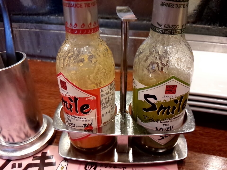 メニューの他にやきとりのお肉を取り出すトリッキーなるものと、タバスコが2種類。このタバスコはゆずでできていて「ユズスコ」というそうです。面白いですね。