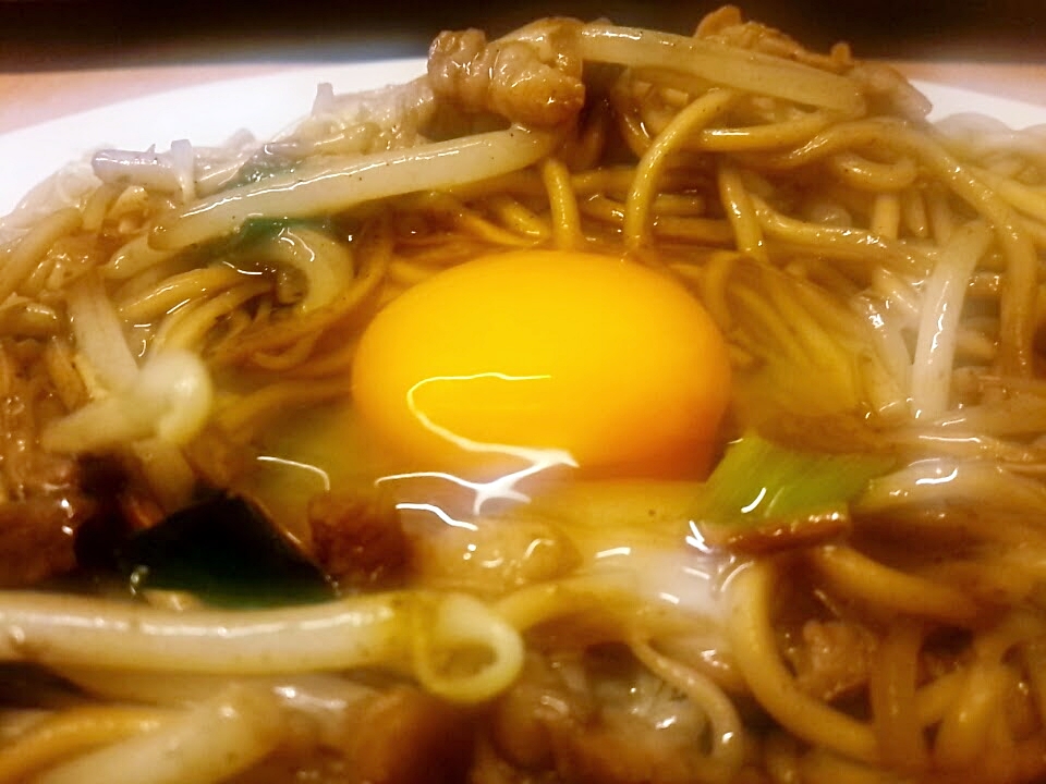 ホカホカのソース焼きそばに生卵のビジュアルは、やばいぐらい食欲をそそりますねぇ~。そりゃスマホのカメラも湯気で曇るってもんです。