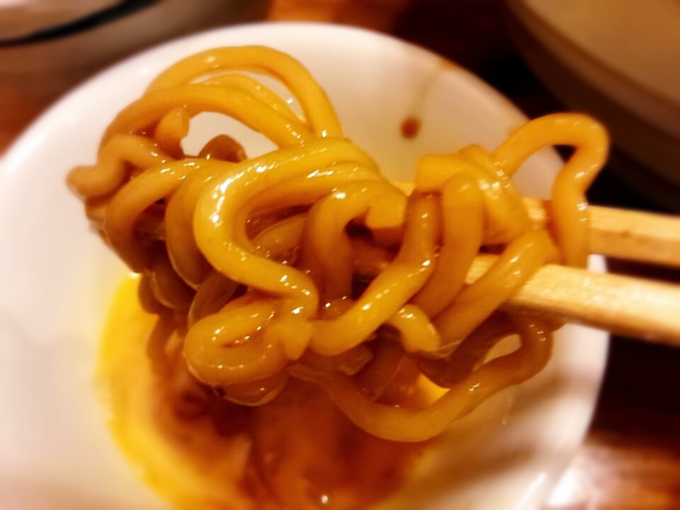 商品の注意書きに「しょっぱい」のと「コショウがたっぷり」と書いてあるのでどんなものが出てくると思いましたが、想像以上に真っ黒でコショウの香りが強くてビックリ!デフォでごはんと生卵がついてきて、麺を卵につけて食べるのが良いみたいです。すき焼きみたい。
