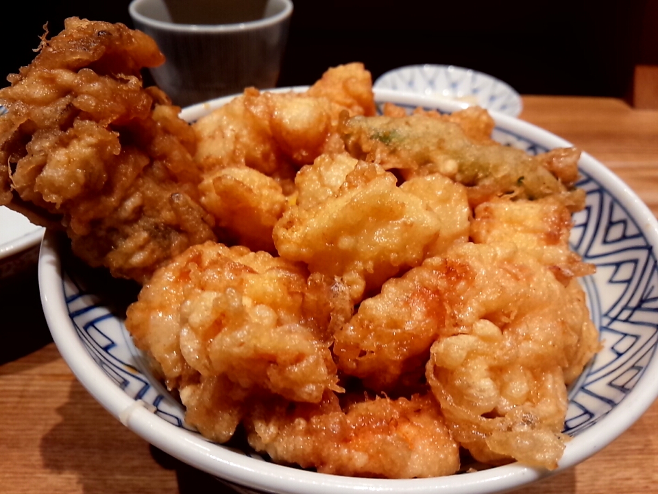 衣はフリッターみたいにふかふかかと思えば、意外と薄め。でも剥がれないでしっかりしているのは揚げ方が上手なのかな?この衣が濃い目でキリッとしたタレを含んて美味しい。海老は小エビとはいえプリっとしているし、イカもやわらかく噛みきれないような事もありません。野菜の香りと風味もちょうど良いアクセントですね。