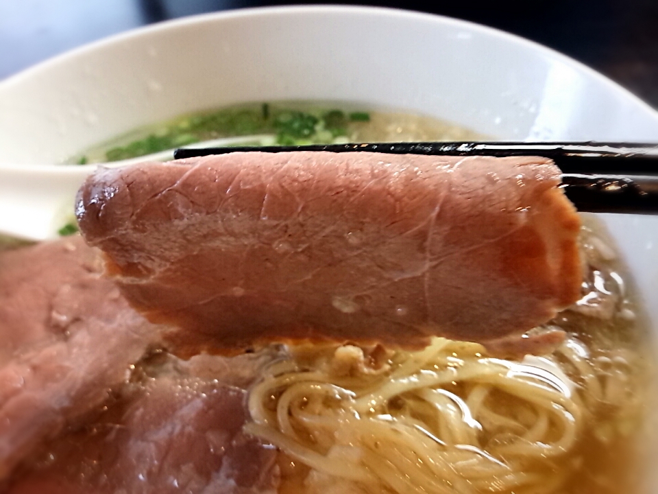 ローストビーフが3枚のったビジュアルは中々の迫力。黄金色のスープに膜を張った油が綺麗ですねぇ。お肉に隠れて見えませんが、刻んだ牛肉も入ってます。贅沢!