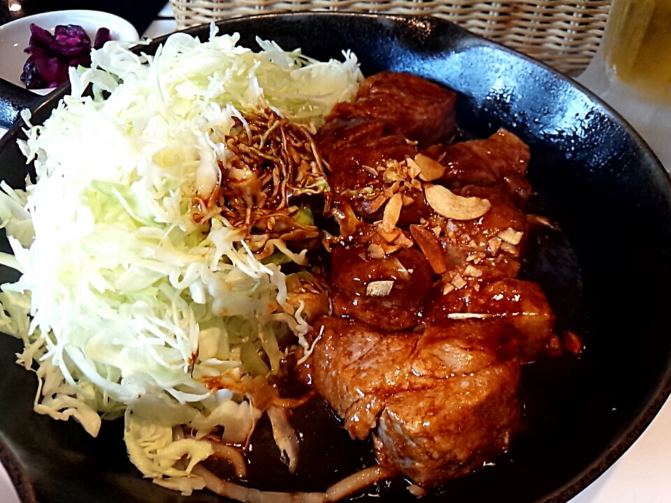 ソースもコクとデミグラのようなビターな苦味、それにニンニクが効いていてご飯が進みますねぇ~、ほんと白飯が進む。たっぷりキャベツも口直しに役たちます。