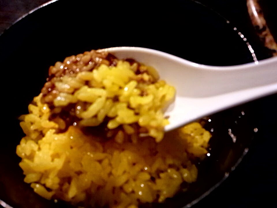 カレーの黒とサフランライスの黄色によるコントラストが美しい。これできっちりカレーを最後まで楽しめるました。麺以外の食べ方があるお得感も良いですね。