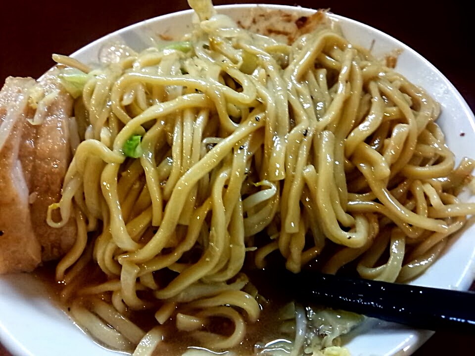 なるべく中だるみしないように豚を齧り野菜を食べ麺を啜っりますが、さすがに中盤を過ぎる頃には苦しくなってきました。くっそー!昔は二郎も小なら完食できたのにアラフォーとなるとこうも厳しいのか・・・泣く泣く残してお店を出ることになりました。