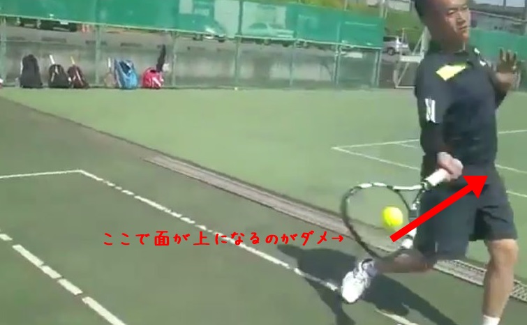 1:インパクトでラケット面を上に向けない(ボールを浮かせない)