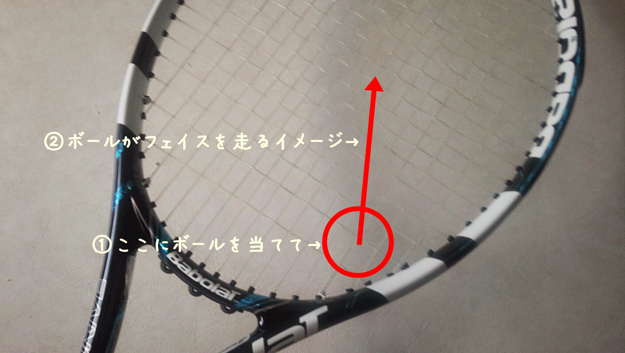 バボラのラケットだと下側に白いラインがあるのでわかりやすいですが、右下の根本でボールを捉えてフォロースルーで運ぶような感覚がある時は良い感覚で厚いスライスが打てます。