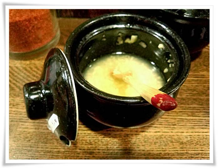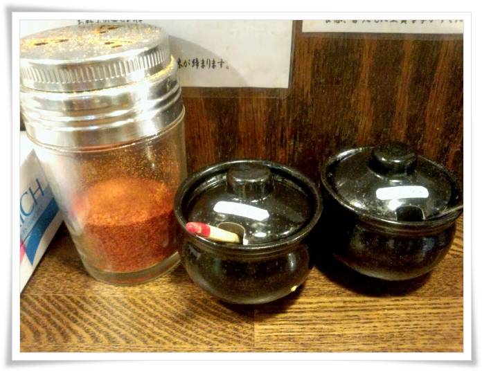 カウンターには薬味が3種類。 七味にんにく、そしてレモン生姜です。