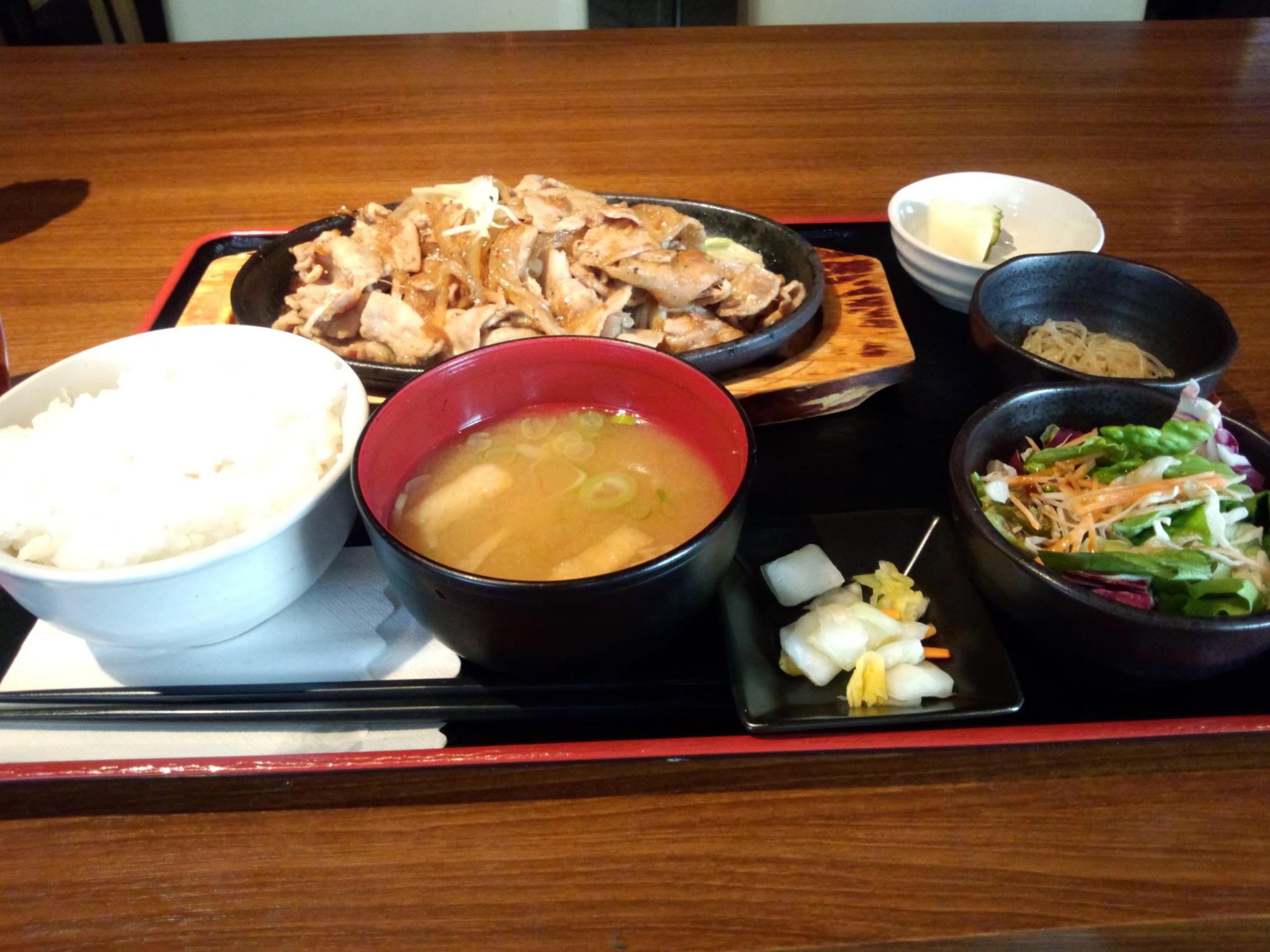 メインの生姜焼きはアツアツの鉄板にのって提供されます。 ジュージュー油の跳ねる音が食欲をそそりますね~。 ボリュームのなかなかのもので、この量ならご飯3杯はいけちゃいそう!