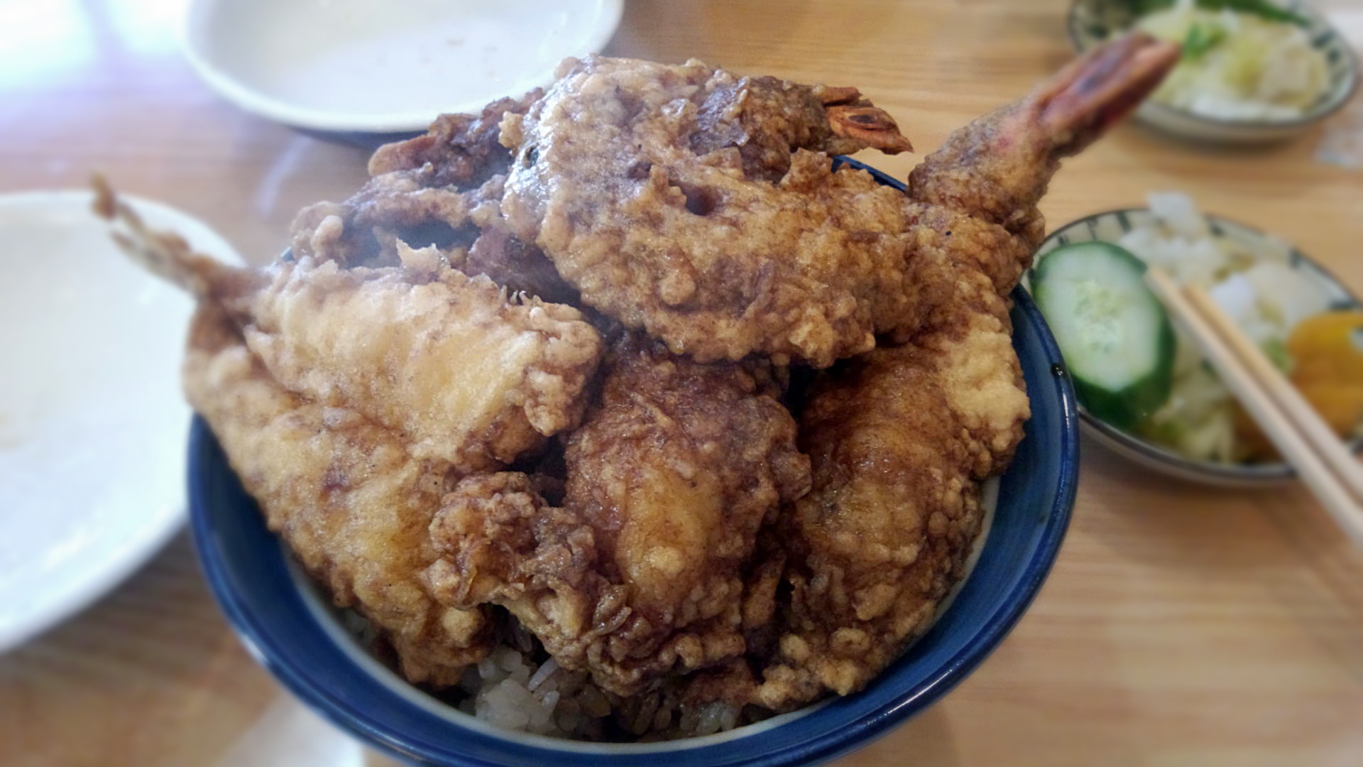 海老に魚(キスかな?)、それに小柱とイカのかき揚げがドーン!ものすごいボリューム感に圧倒されそうです。山盛りなので丼の蓋がしまらないのには驚きました。蓋を開けた時に立ち上がる蒸気と天ぷらの香りがたまりませんねぇ~。