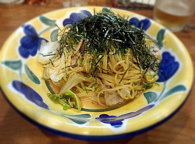 今日はおススメの豚肉と春キャベツの和風パスタをチョイス。もちろんビールも忘れない。