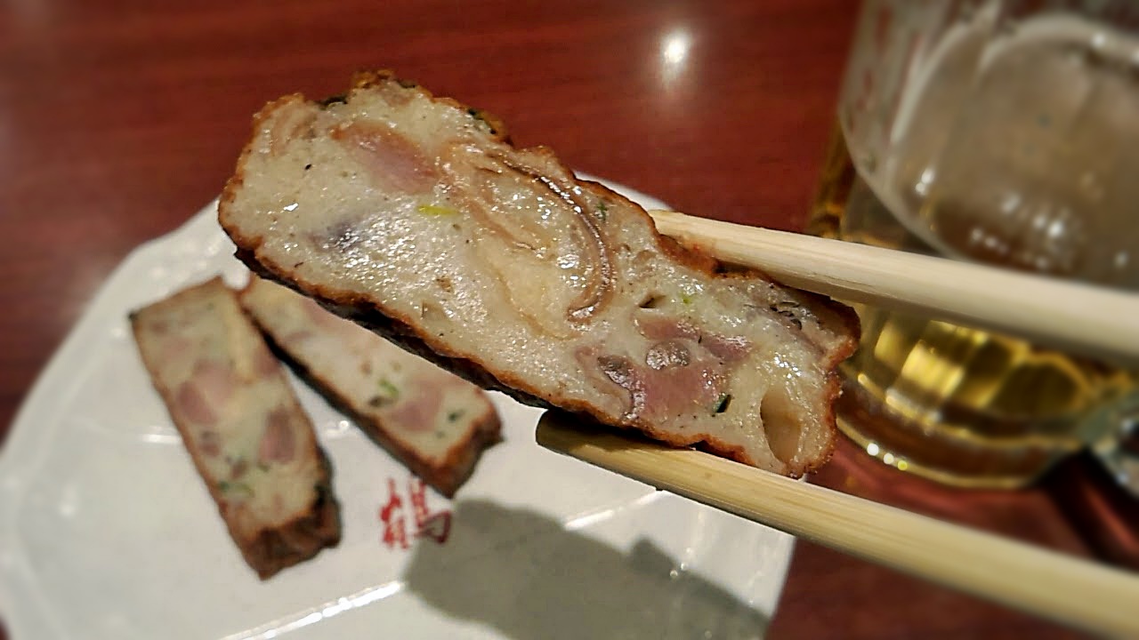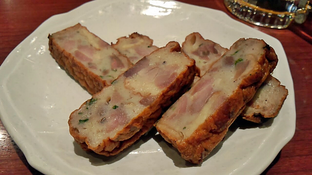 こちらはおや天。いわゆる鶏肉入りさつま揚げといったところ。普通のさつま揚げと違うのは、中に鶏肉が入っていることでしょうか。