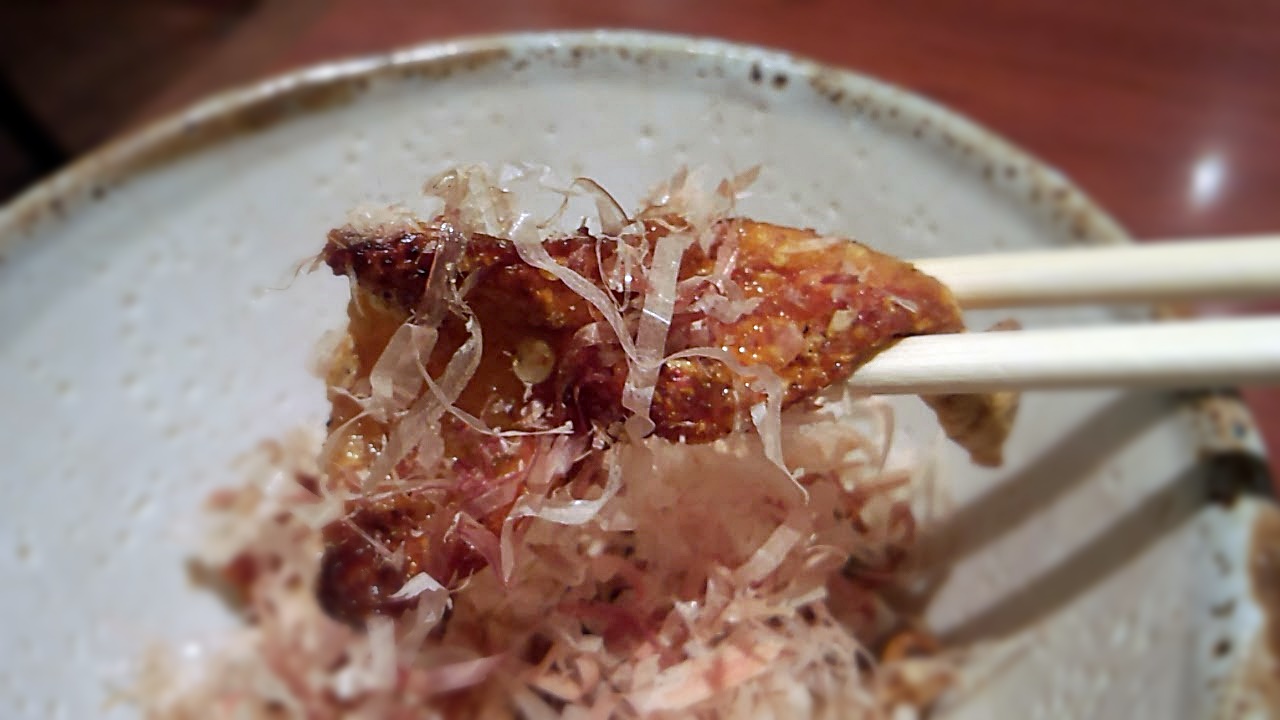 カリッカリに揚げてあるので、食感もとうぜんパリパリ。皮下の脂も残っているので噛めば噛むほど脂が出てきてウマイ!揚げていてもちゃんとしっかり油切りされているのもポイント、そのおかげでくどくなるところをポン酢の酸味で十分美味しく食べることができます。