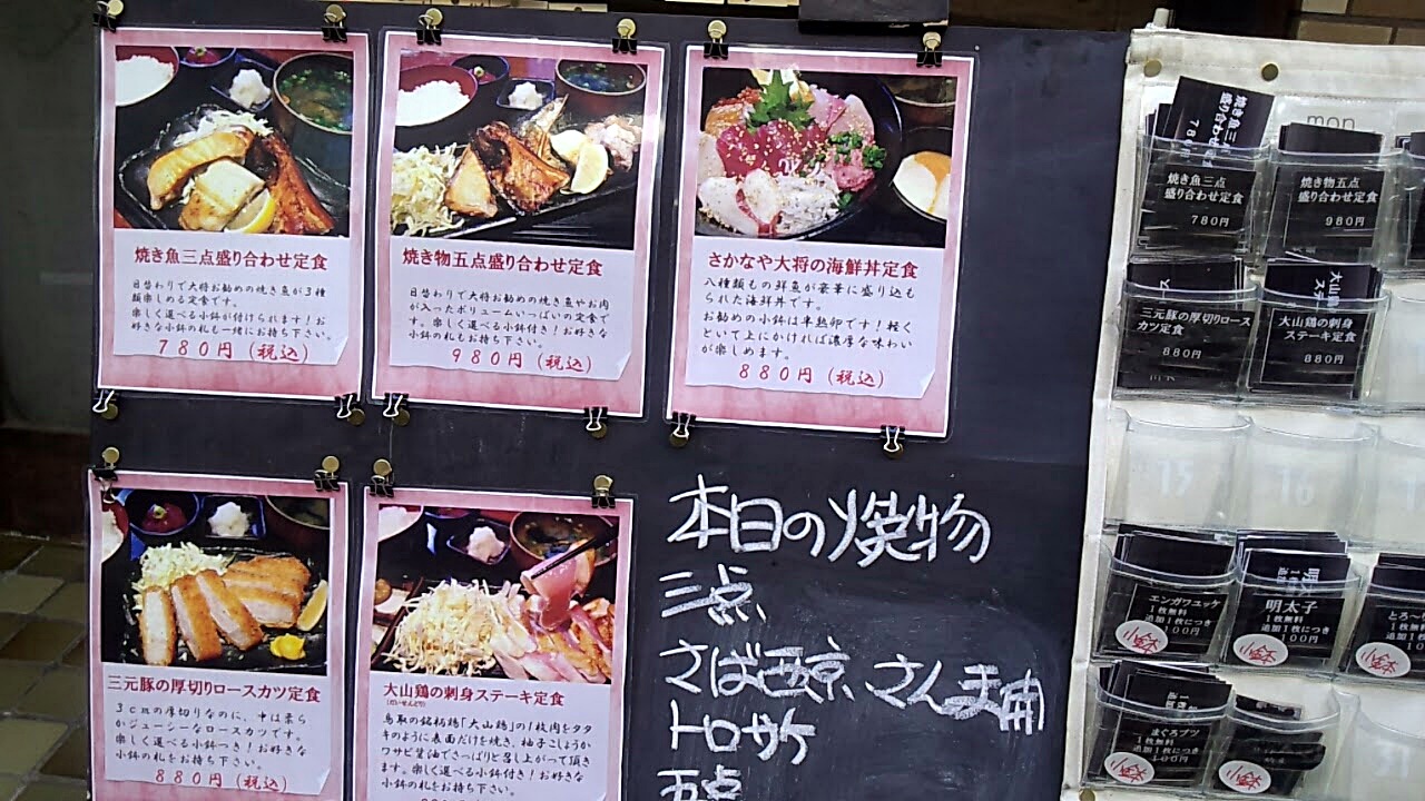 メニューは魚の他にお肉を含め5種類、それに小鉢を1つ選べるシステムです。メインの定食は焼き魚や海鮮丼の他にも、大山鶏の刺し身ステーキ定食なんてのありました。小鉢は納豆やエンガワのユッケ等選ぶ楽しみがあるのは嬉しいですね。