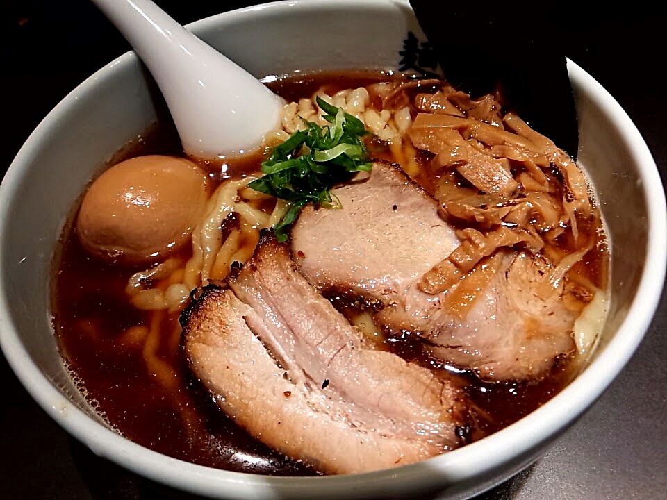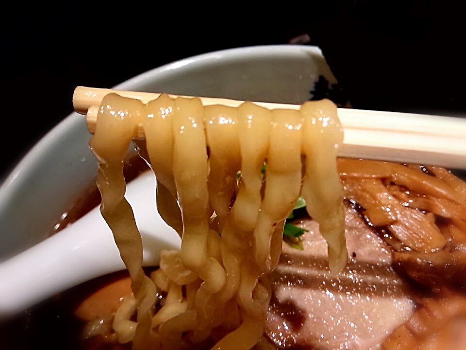 スープは見た目の黒さ(濃さ)程しょっぱく無く、かなりのさっぱり仕上げで上品な感じ。動物系に魚系が混ざっているらしいんですが、なんともどっちつかず。