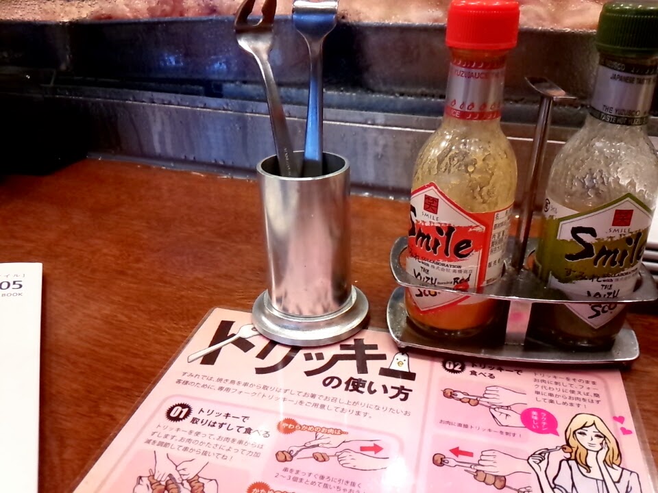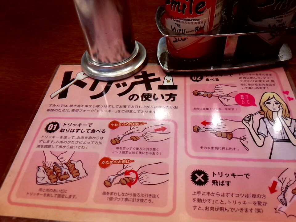 メニューの他にやきとりのお肉を取り出すトリッキーなるものと、タバスコが2種類。このタバスコはゆずでできていて「ユズスコ」というそうです。面白いですね。