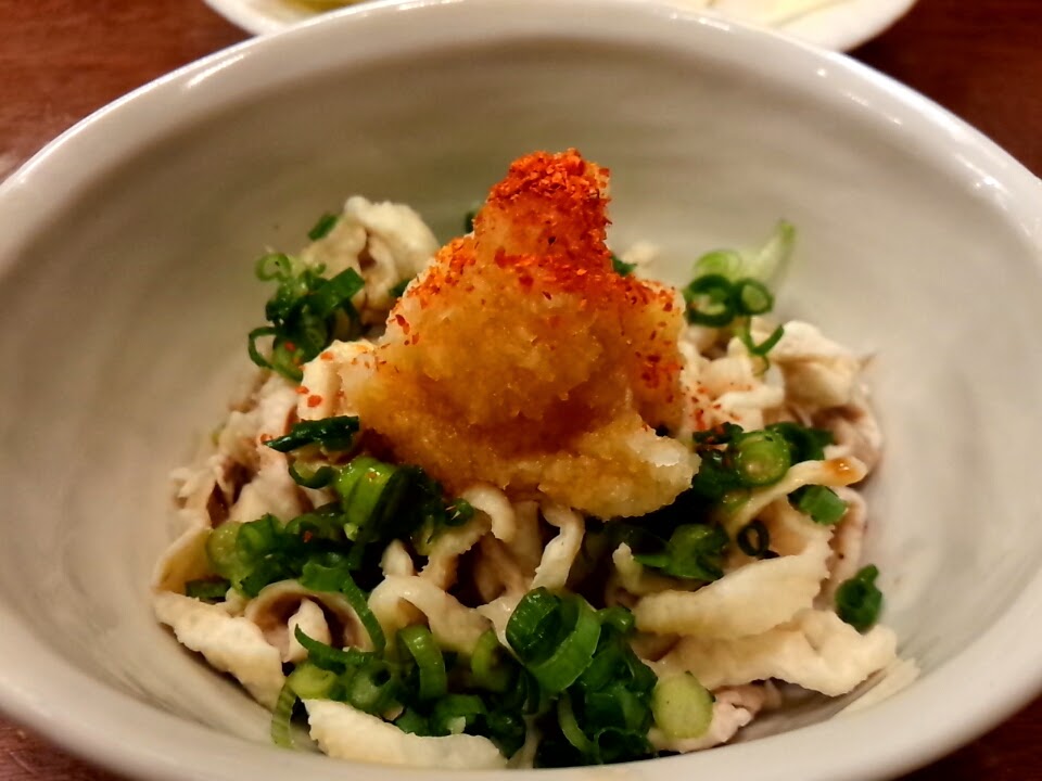まずはビールのツマミにとり皮ポン酢。これは正直普通なお味。かなり細かく皮が刻んであって味わいがいが無いかな。もぅちょっと大きめで弾力を味わえるぐらいが好み。さっきのユズスコをちょっと垂らすといいツマミに早変わり。
