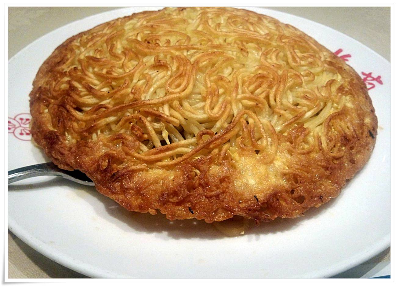 見た目は円盤みたいな形ですが、焼きそばの麺を卵で固めていますね。