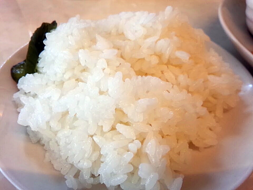 ご飯は平皿にこんもりと盛られています。側にはきゅうりの漬物も。ご飯は普通のお茶碗2杯ぐらいありそうな感じです。ガッツリいけますね。