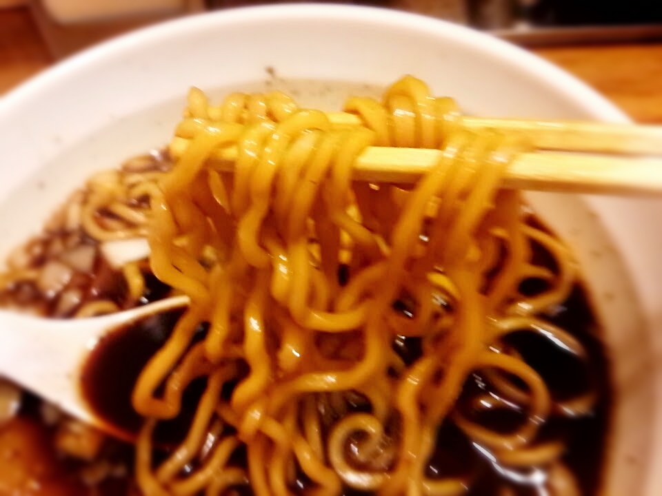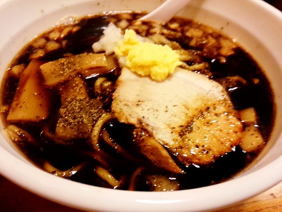 黒中華だけに真っ黒なビジュアルに、目で見てはっきりとわかる程のコショウの量。スープはコクのある醤油がベースなんですが、コショウのパンチがキツすぎて飲めるようなものでは無いです。すりおろした生姜を混ぜても生姜の辛みが上乗せされて予想と見た目以上にきっつい。