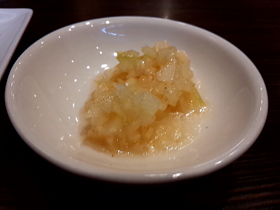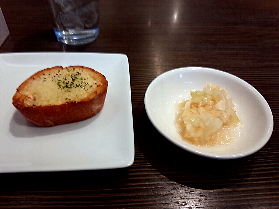 ラーメンには珍しいガーリックトーストと刻みタマネギの酢漬けです。この組み合わせだとまるで洋食屋さんで食事してるみたいですね。