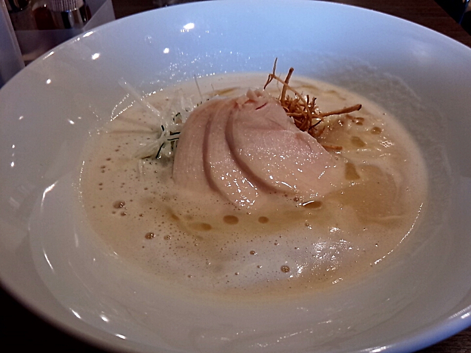 着丼したラーメンの第一印象はオシャレ。白湯スープに白いドンブリを合わせてきたり、食材の色目を抑えた盛り付けから感じるのかな。ここで安易に黒ドンブリを使わない所にセンスを感じますなぁ~。
