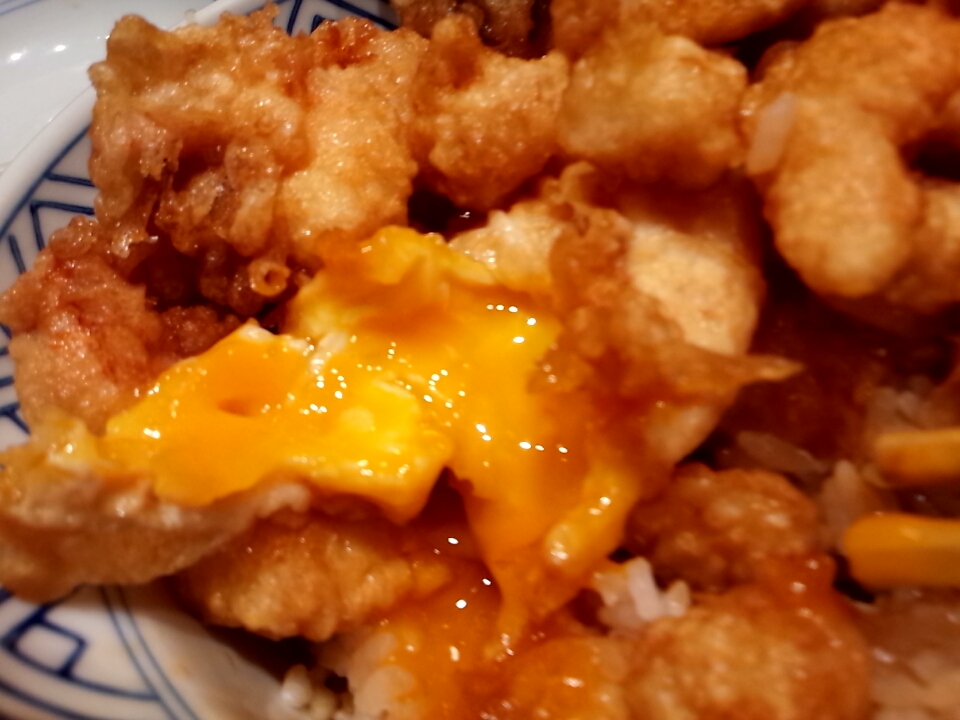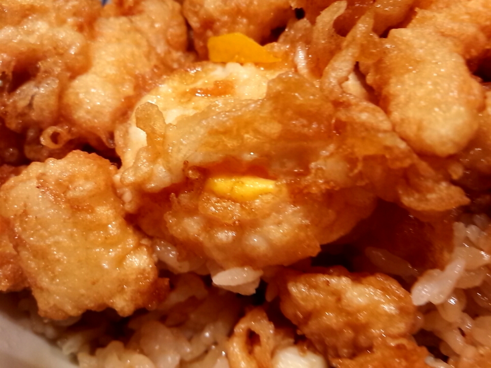 蓋を開けるとタレと油の香りに蒸気がむわ~と立ち上がってきてたまりません。天ぷらもぎっしり詰まってますねー。タネは小エビ、イカ、獅子唐に舞茸。そして真中に卵!卵の天ぷらって初めて食べますよ。