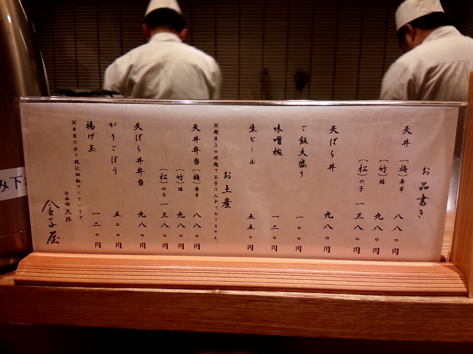 先に3名の団体様が待っていたのでその後ろにならびつつ店内を見ると、黙々と天ぷらを揚げる職人さんの姿が見えます。和食の職人さんの後ろ姿はカッコいいですなぁ、見てて飽きません。そして待つほど5分程で席に案内して貰えました。