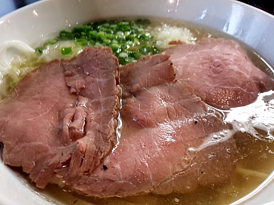 メニューは醤油か塩を選べるので、塩をチョイス。牛骨ラーメンって脂の甘みが強いのが特徴だと思うんで、それだと塩の方がよくわかるんじゃないかなって。せっかくだから贅沢にローストビーフが乗ったやつでいきましょう!