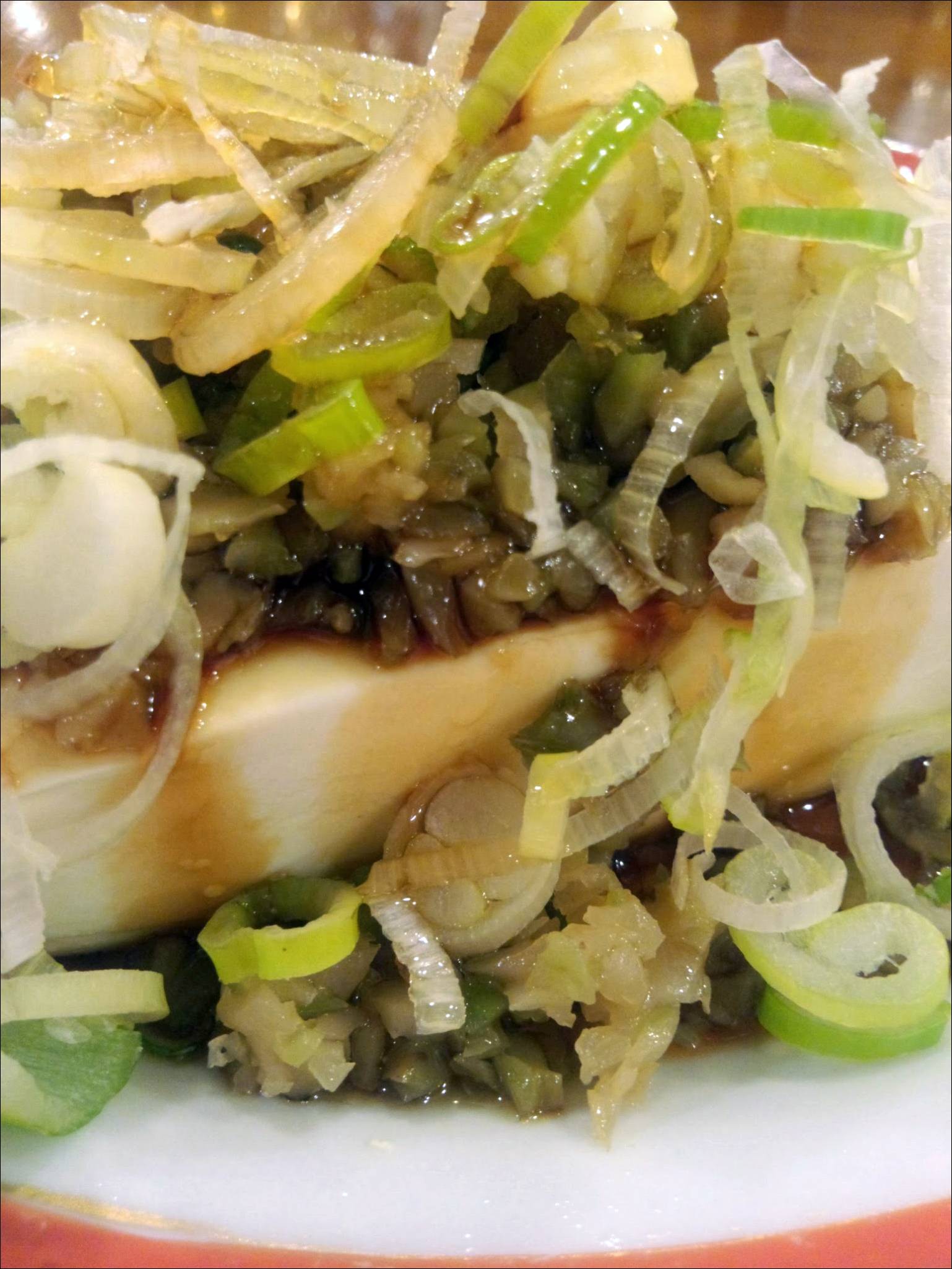 ちょいと薄めの冷ややっこに、細かく刻んだザーサイに刻みネギがトッピング。